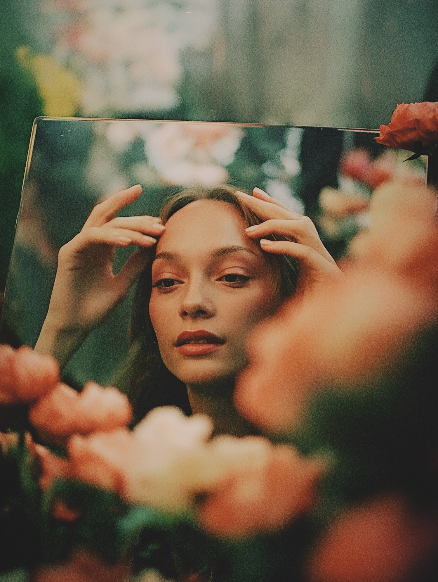A woman gazes into a mirror surrounded by soft-focus flowers, creating a dreamy and ethereal atmosphere with warm lighting.