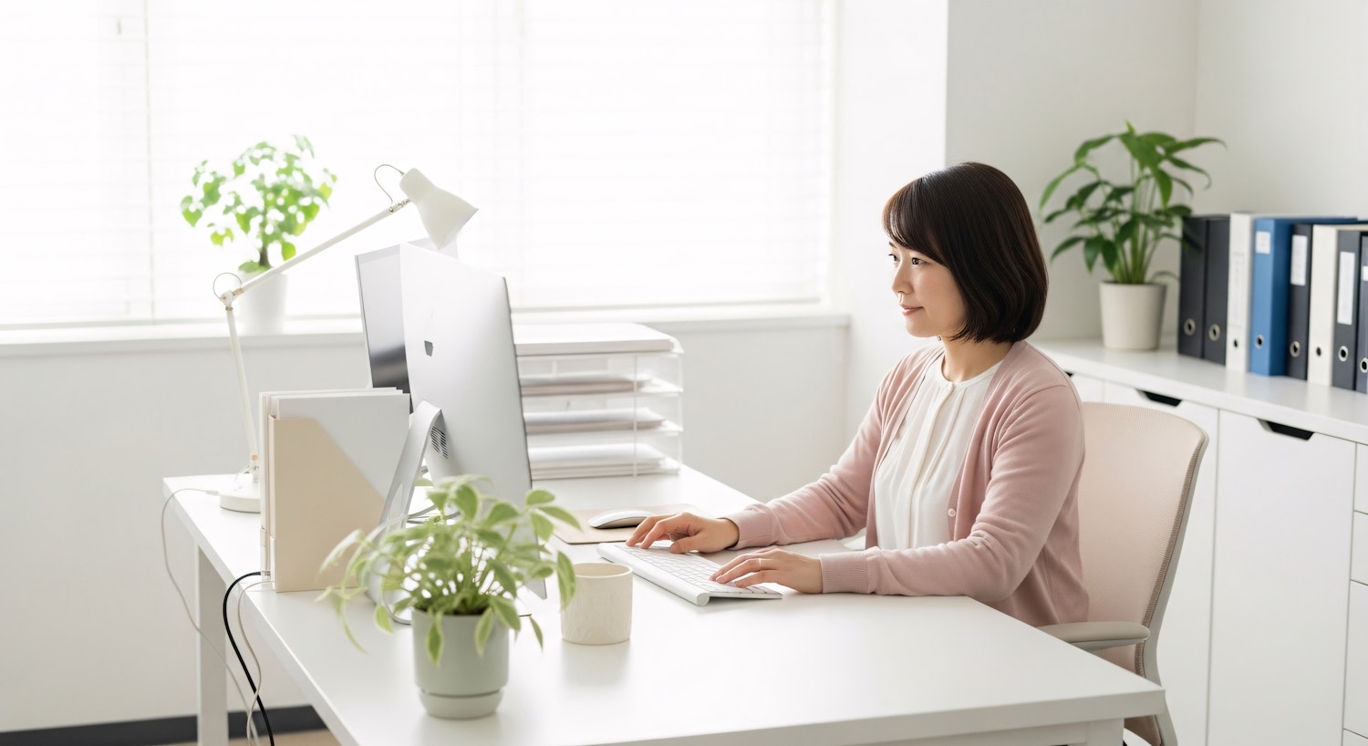 A woman working at a clean, modern desk with a computer, plants, and organized files in a bright office space.