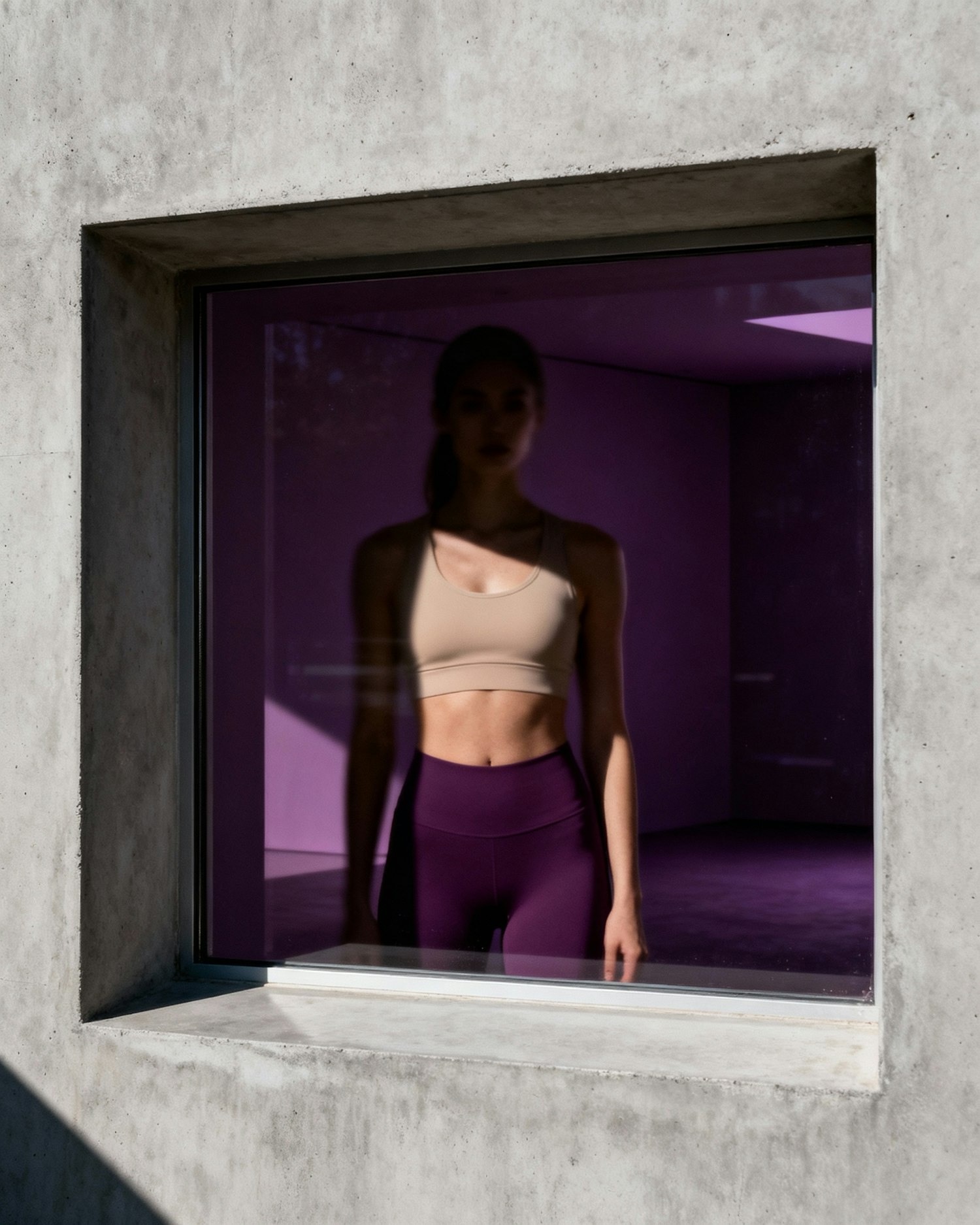 High-end editorial sports photography, soft directional lighting, sculptural shadows, premium activewear textures, muted beige and deep plum tones, clean minimal background, cinematic sophistication, realistic skin texture, no overprocessed look, elegant composition, high-fashion athletic aesthetic. A minimal deep-plum room with a large square concrete window. A blurred feminine silhouette stands behind the glass, barely visible, creating intrigue. Soft dusk light outside, clean interior lines, cinematic editorial campaign vibe.