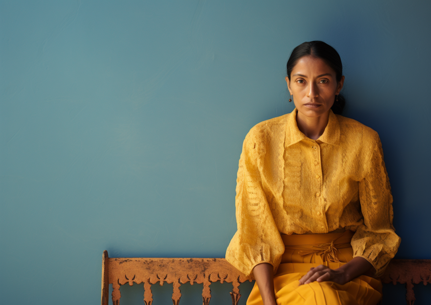 Woman in yellow outfit against teal wall, seated on ornate bench. Striking contrast between vibrant yellow and cool teal background.