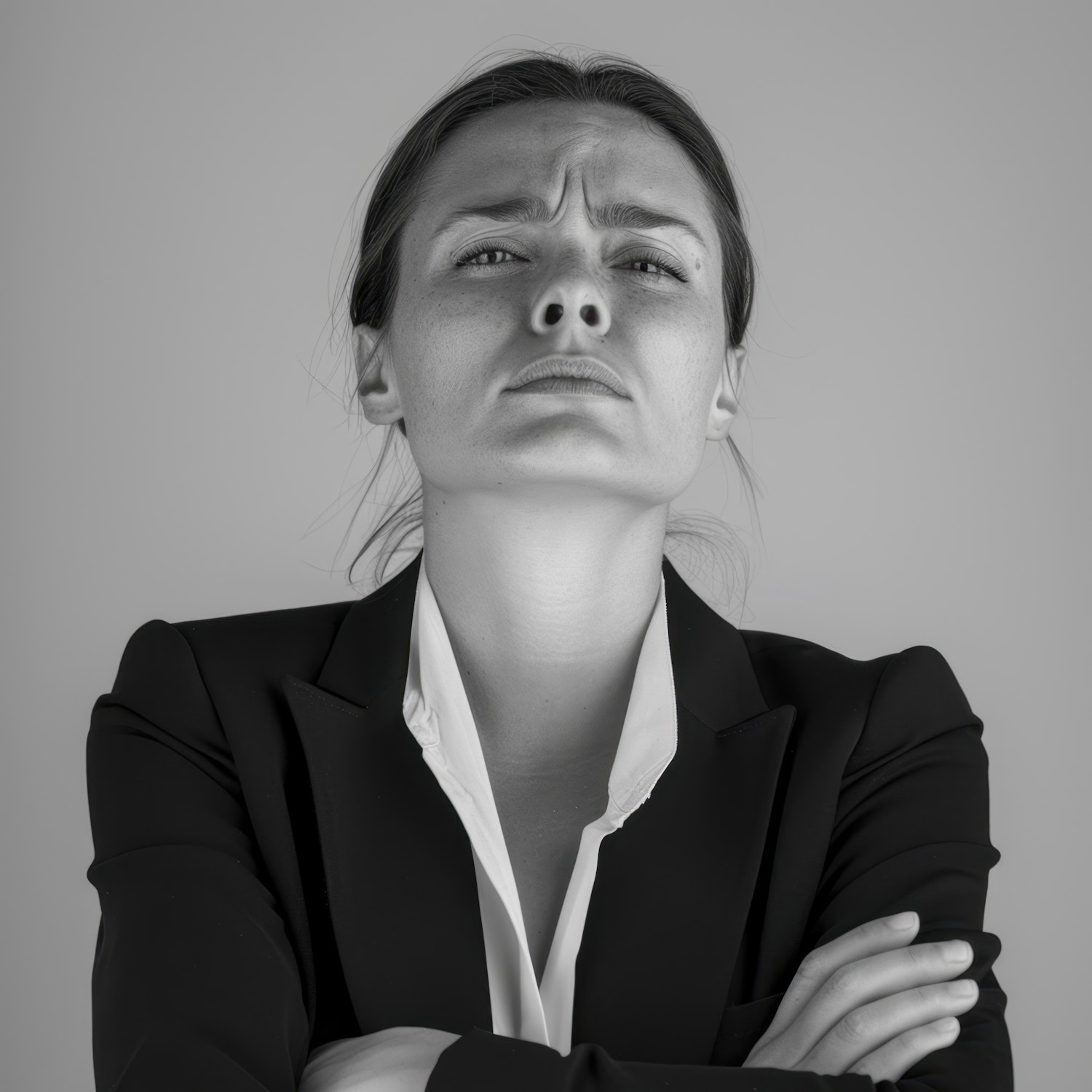 Black and white portrait of a woman in a blazer with a serious expression, arms crossed, looking upwards.