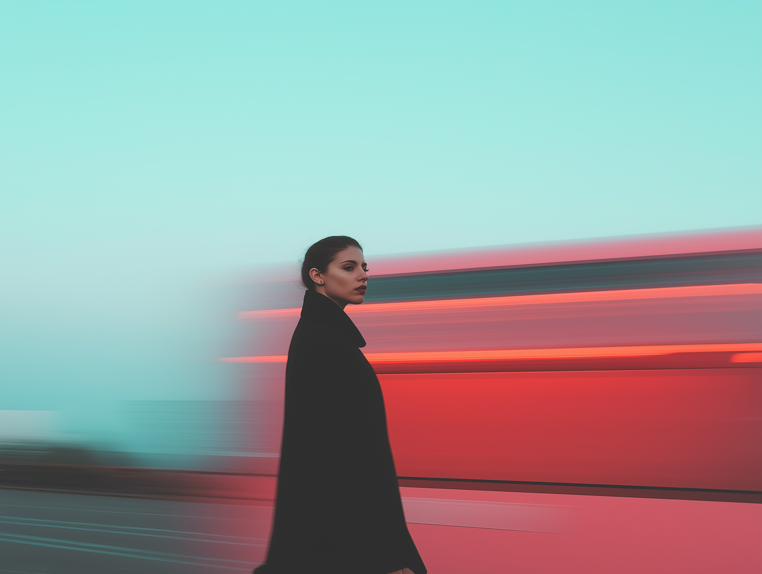 Woman in black coat with blurred red and turquoise background, creating a dynamic and modern visual effect.