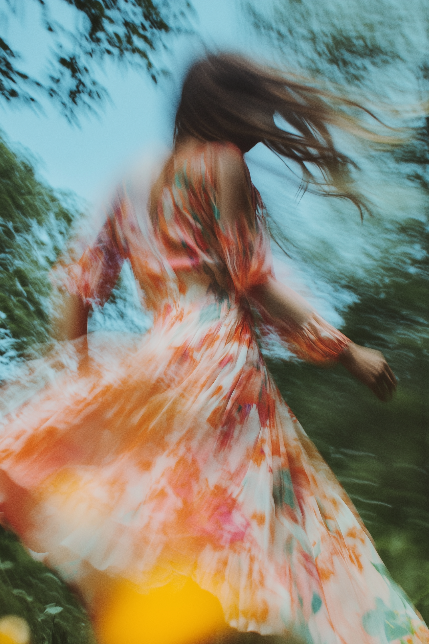 A dreamy, blurred shot of a woman twirling in a vibrant floral dress, surrounded by lush greenery and a bright blue sky.