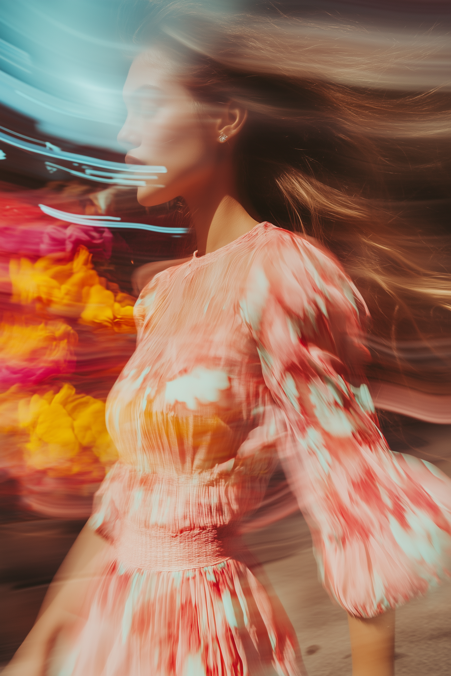 A vibrant motion-blur portrait of a woman in a floral dress, surrounded by warm colors and dynamic light streaks.