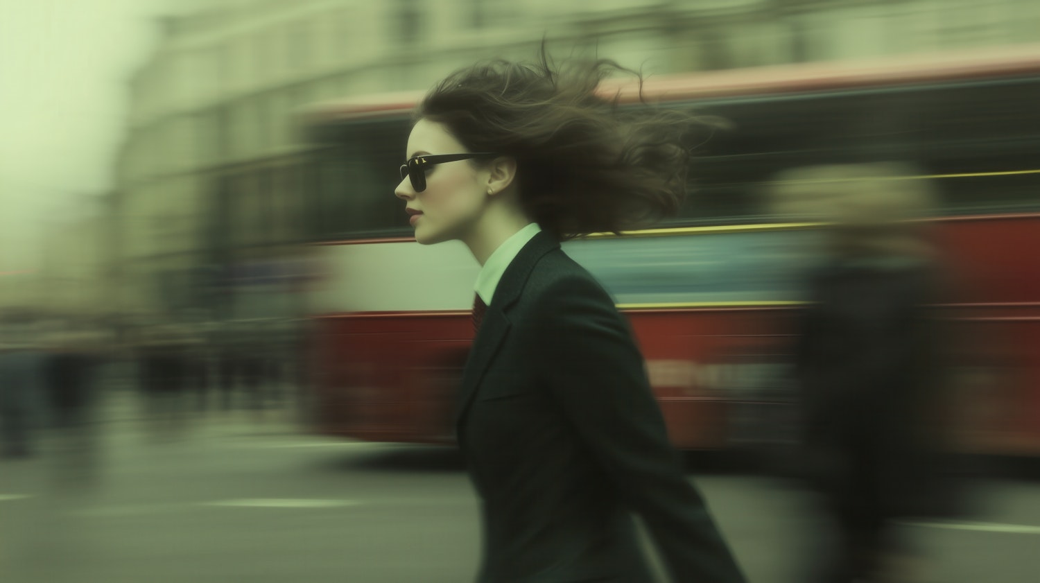 Stylish woman in motion wearing a dark green suit and sunglasses, with a blurred urban background featuring a red double-decker bus.