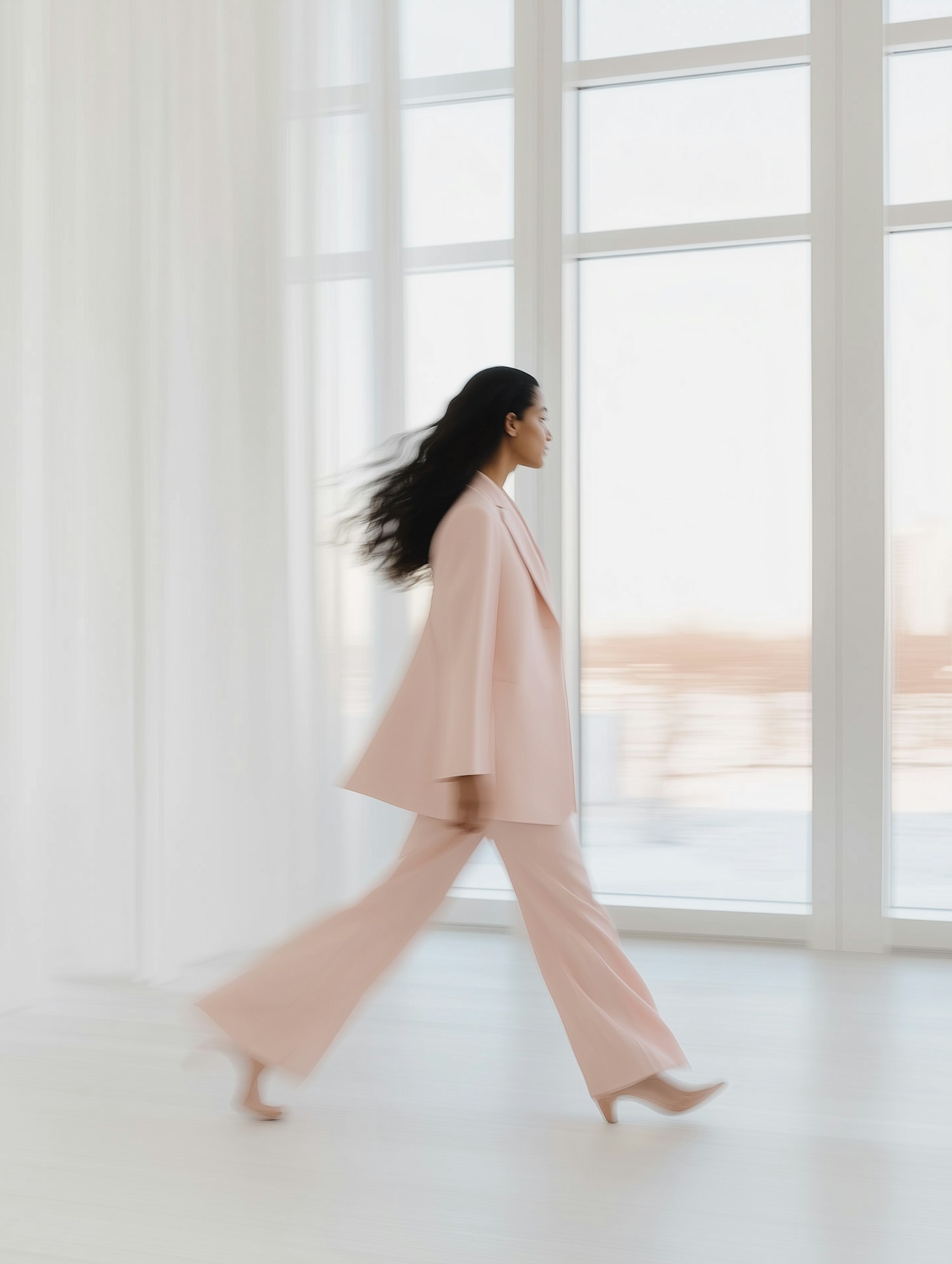 Asian woman in a pink pantsuit walking confidently in a bright, modern room with large windows.