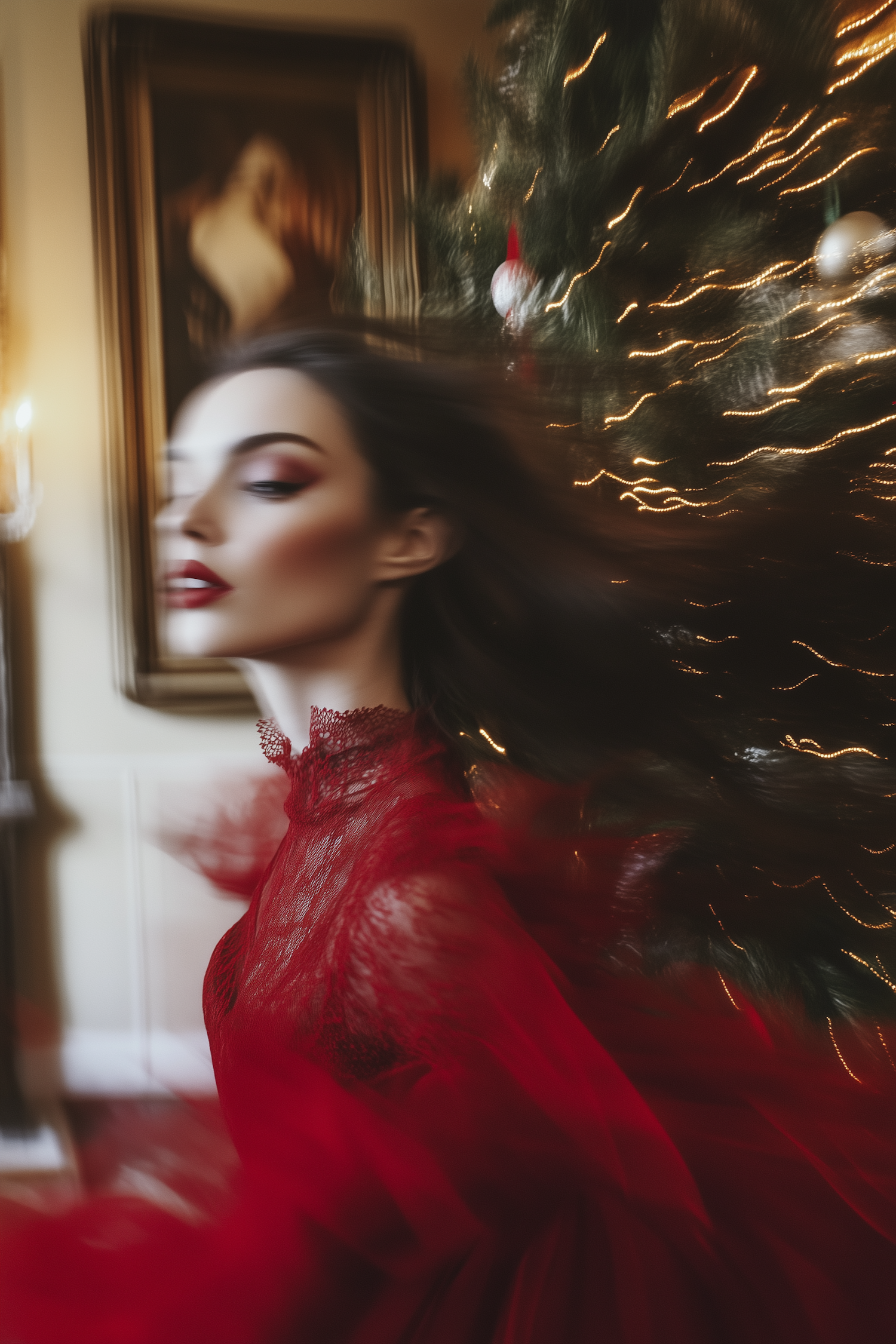 A woman in a red lace dress moves gracefully by a lit Christmas tree, creating a dreamy, festive scene with motion blur.