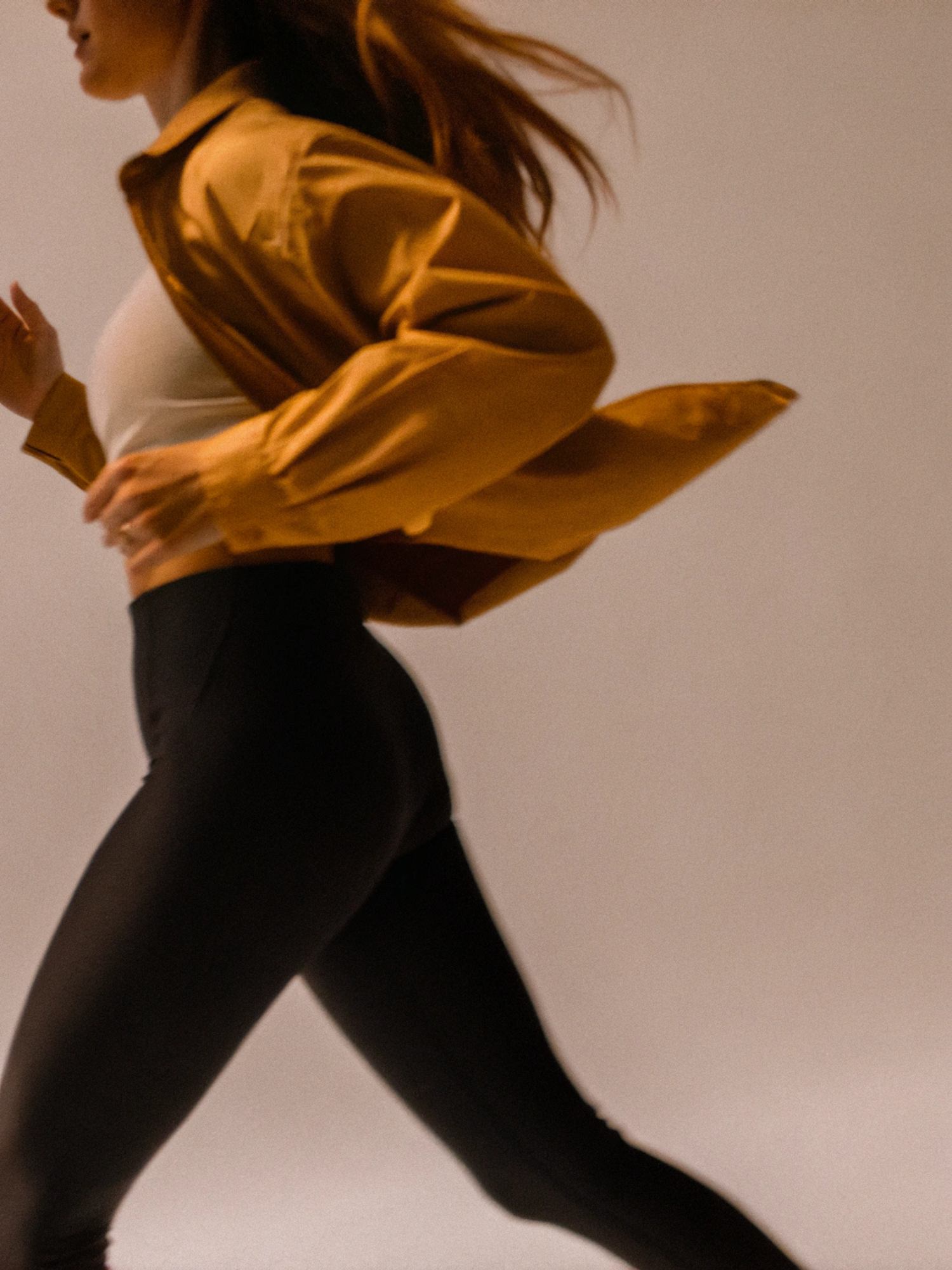 A woman in motion wearing a mustard jacket, white crop top, and black leggings, captured mid-stride against a neutral background.