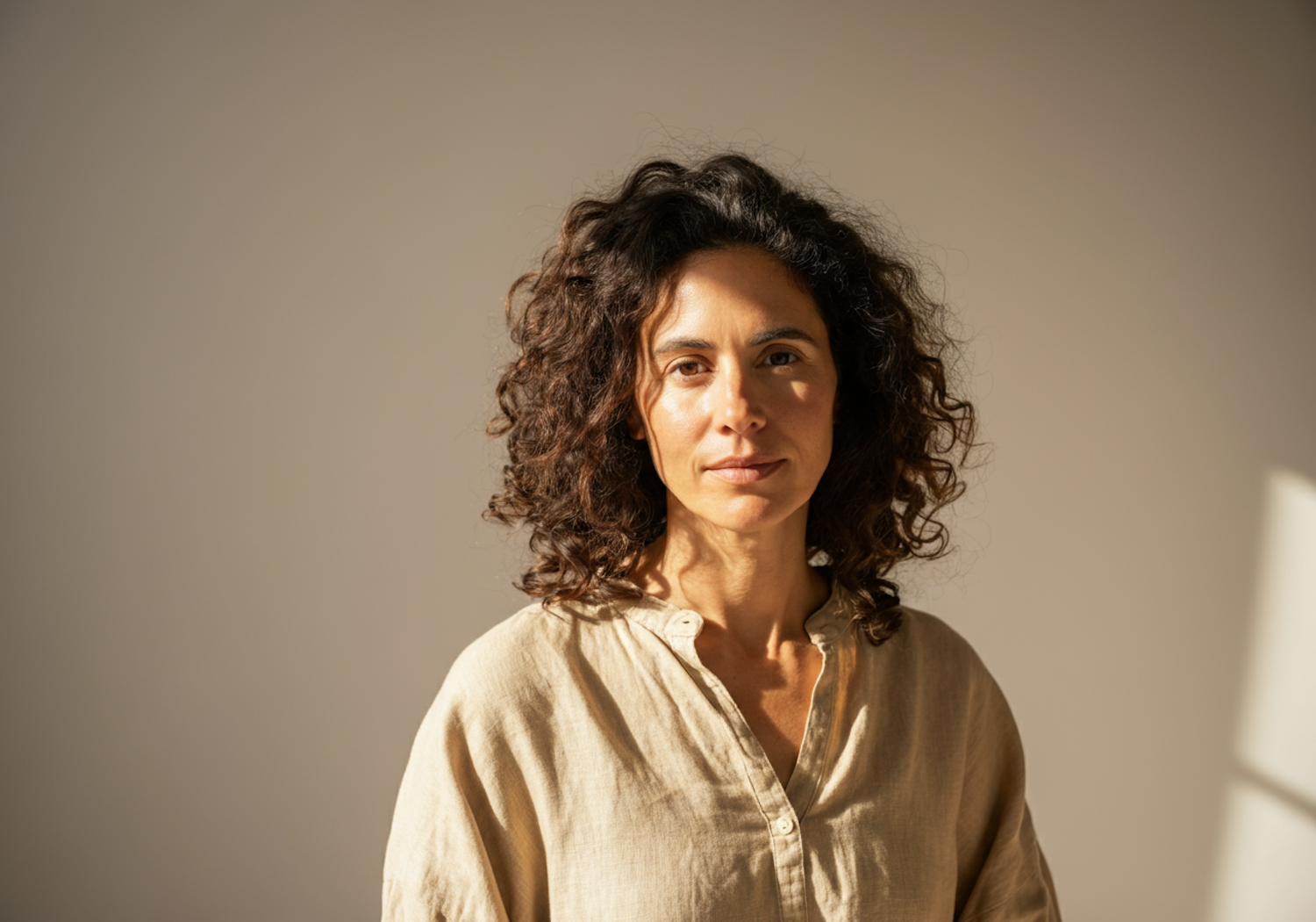 A woman with curly dark hair and a beige shirt stands in soft natural light, creating a serene and minimalistic portrait. professional neutral portrait photo for profile or avatar use .clean, neutral office avatar photo with natural light and simple background