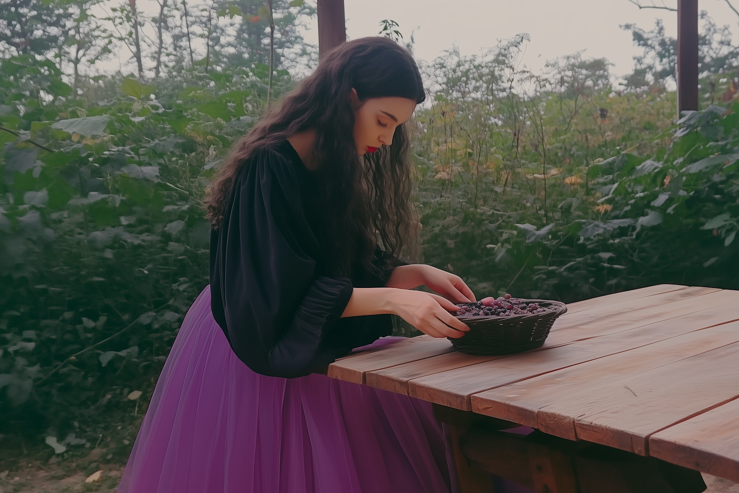 Young woman in a black top and purple skirt, sitting outdoors with a basket of berries, surrounded by lush greenery.