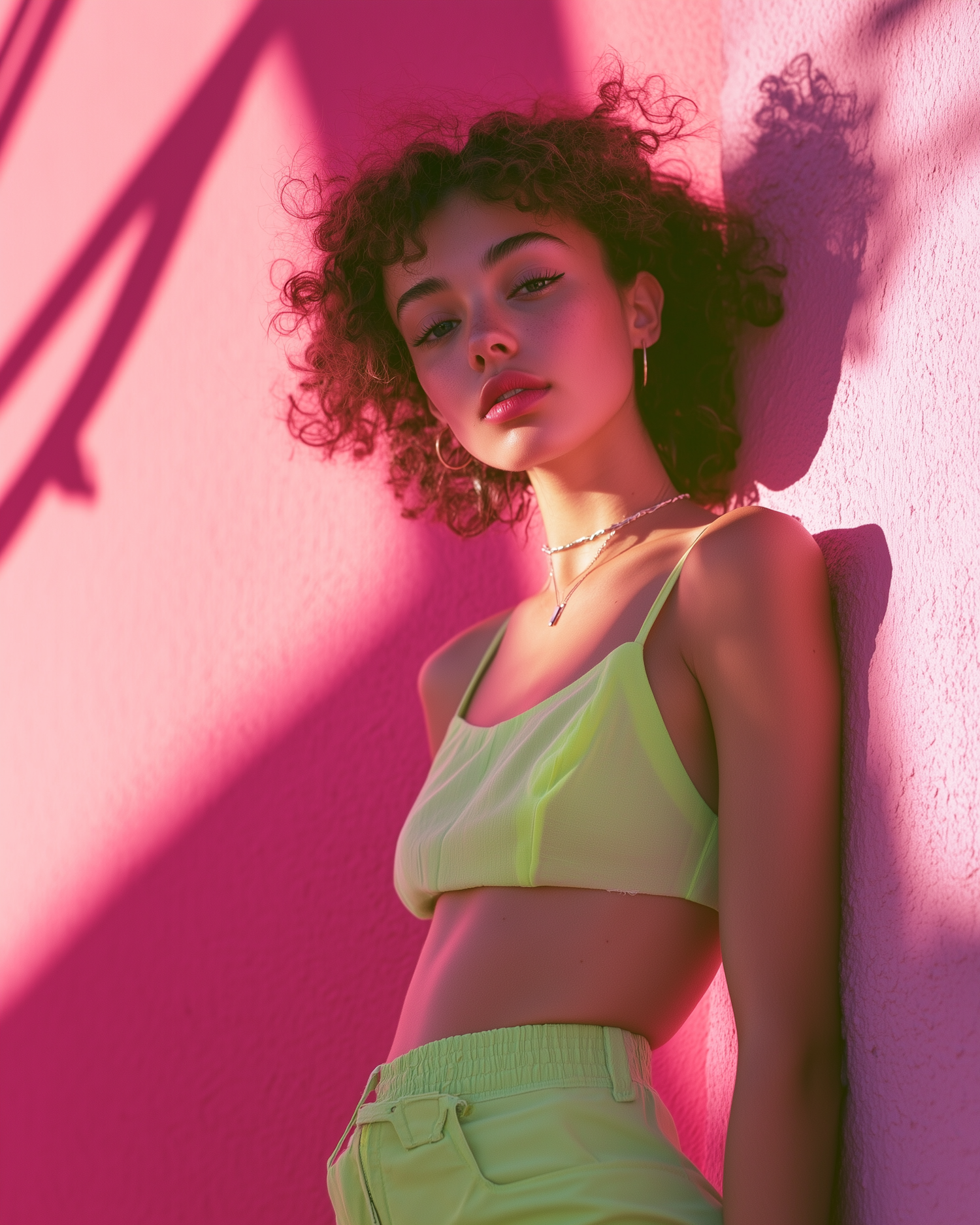 Stylish woman in neon green outfit against a pink wall, with curly hair and confident expression, bathed in dramatic lighting.