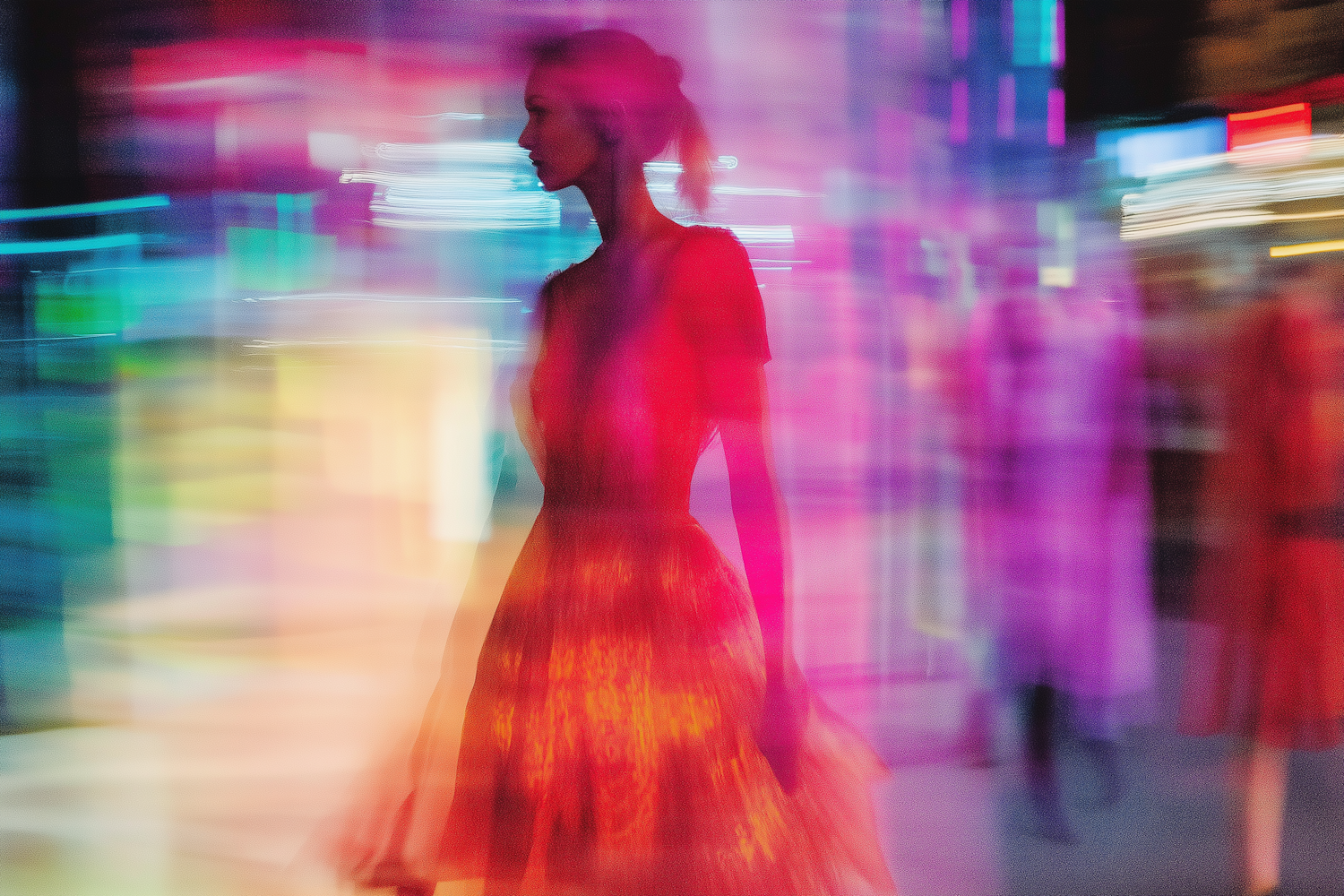 A woman in a glowing red dress moves through a neon-lit scene, surrounded by vibrant pink, blue, and yellow light streaks.
