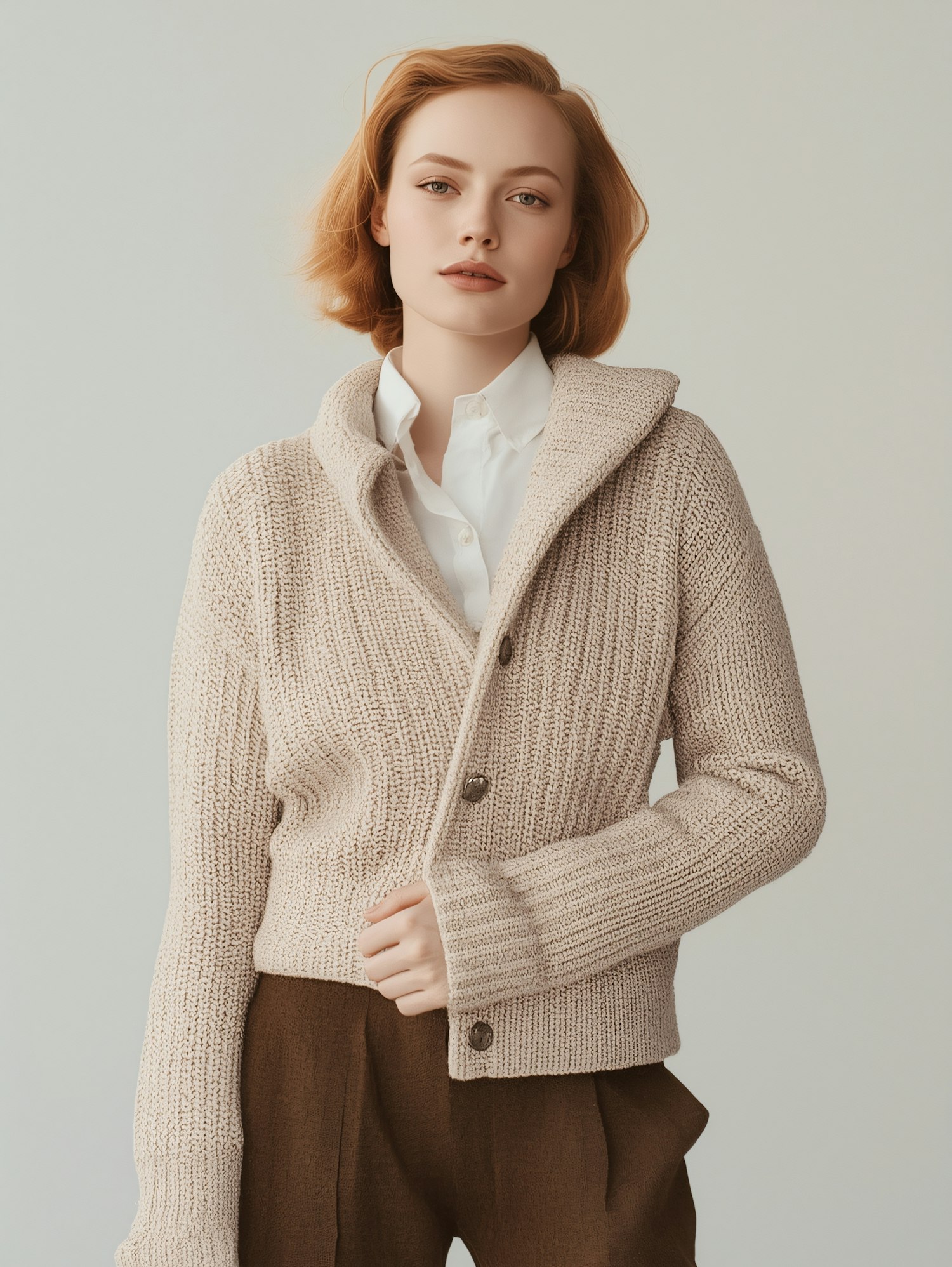 Stylish woman in a beige cardigan and white shirt, paired with brown trousers, posing against a neutral background.