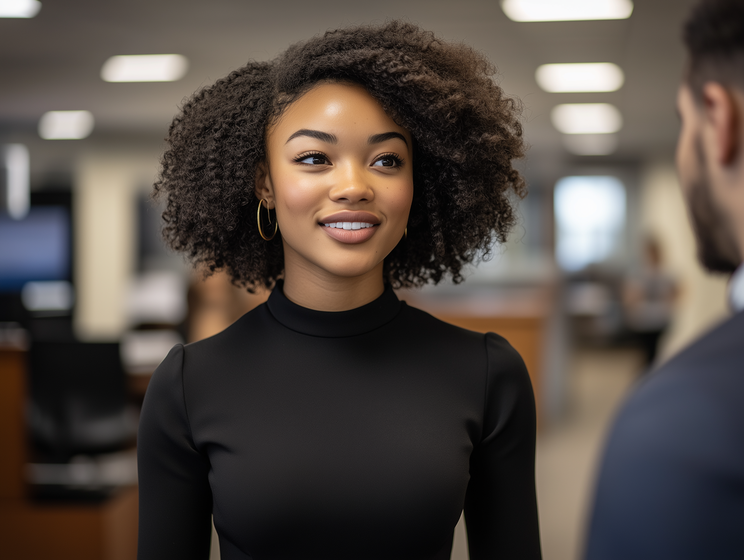 Confident young Black woman with natural curly hair and gold hoop earrings in a professional office setting, engaged in conversation.