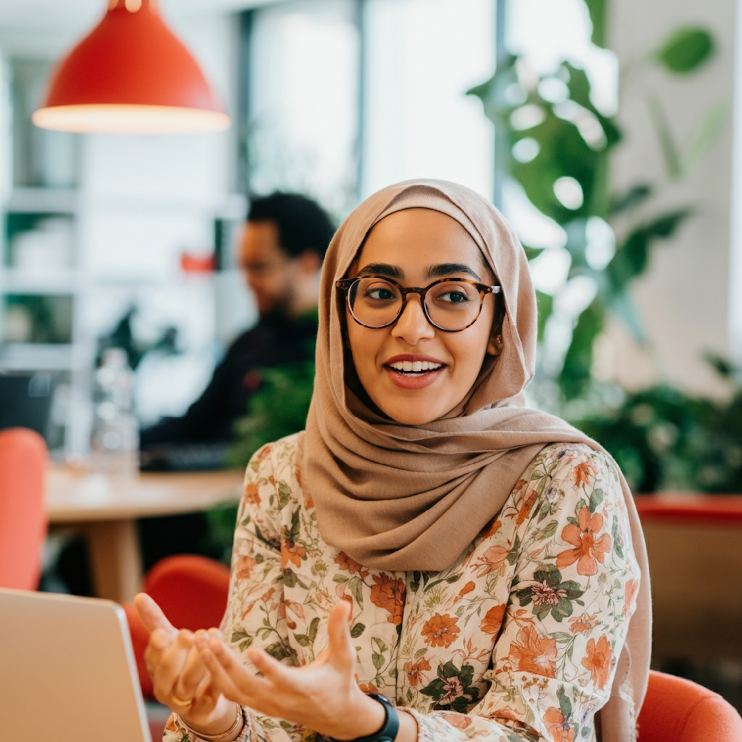 Young woman in a beige hijab and glasses, engaged in conversation in a modern office with plants and a red pendant light.