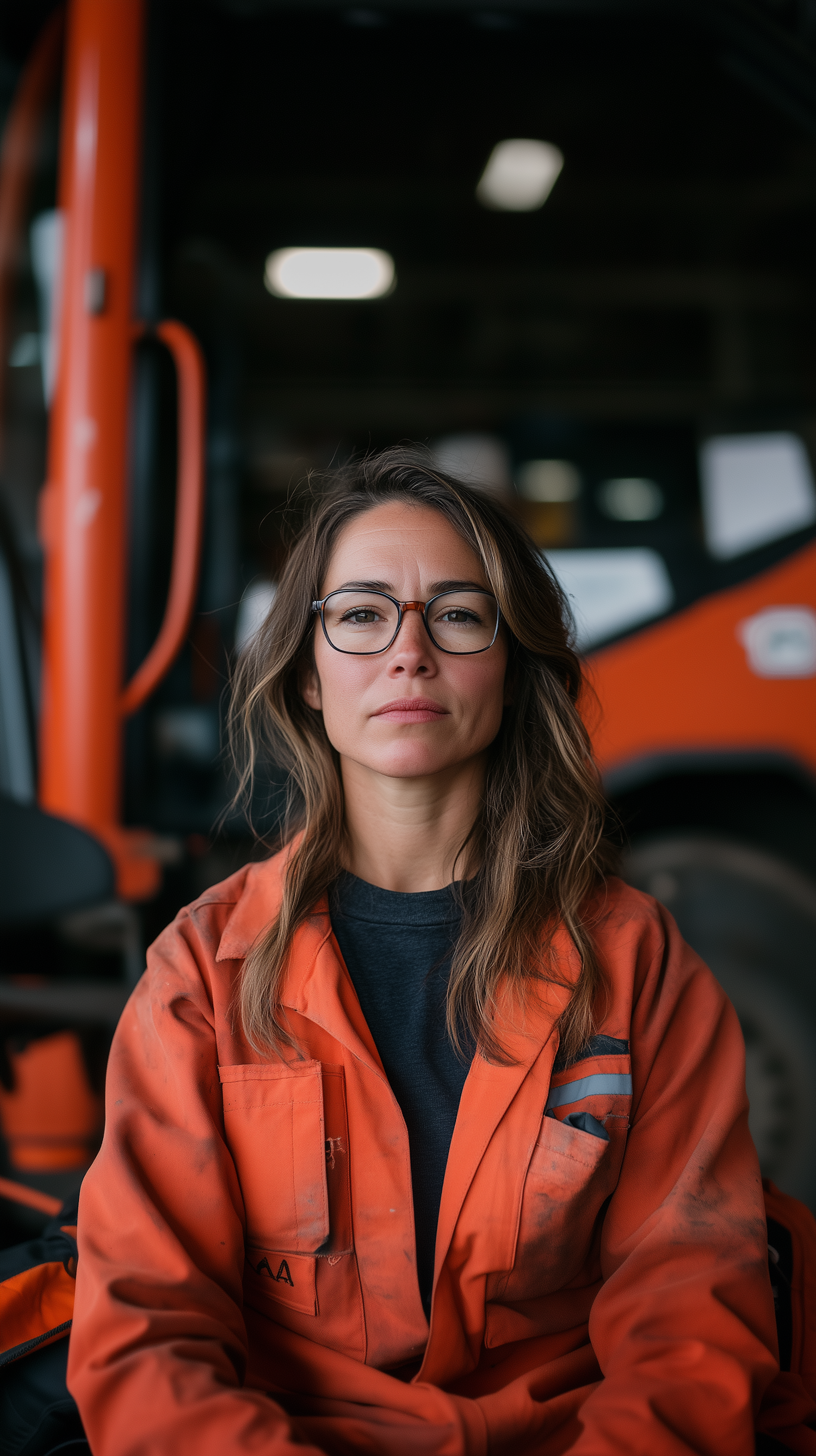 Confident woman in orange work jumpsuit with glasses, standing in front of industrial machinery. Professional and focused expression.