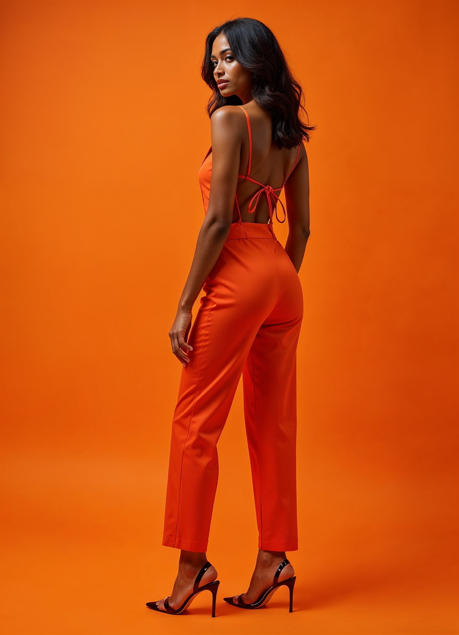 Stylish woman in an orange jumpsuit with open back, posing confidently against a vibrant orange background.