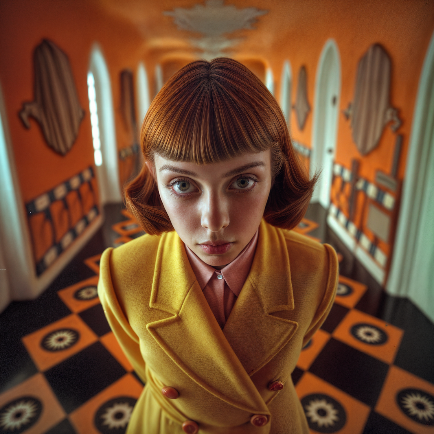 A young woman in a yellow coat stands in a surreal, colorful hallway with bold patterns and a whimsical atmosphere.