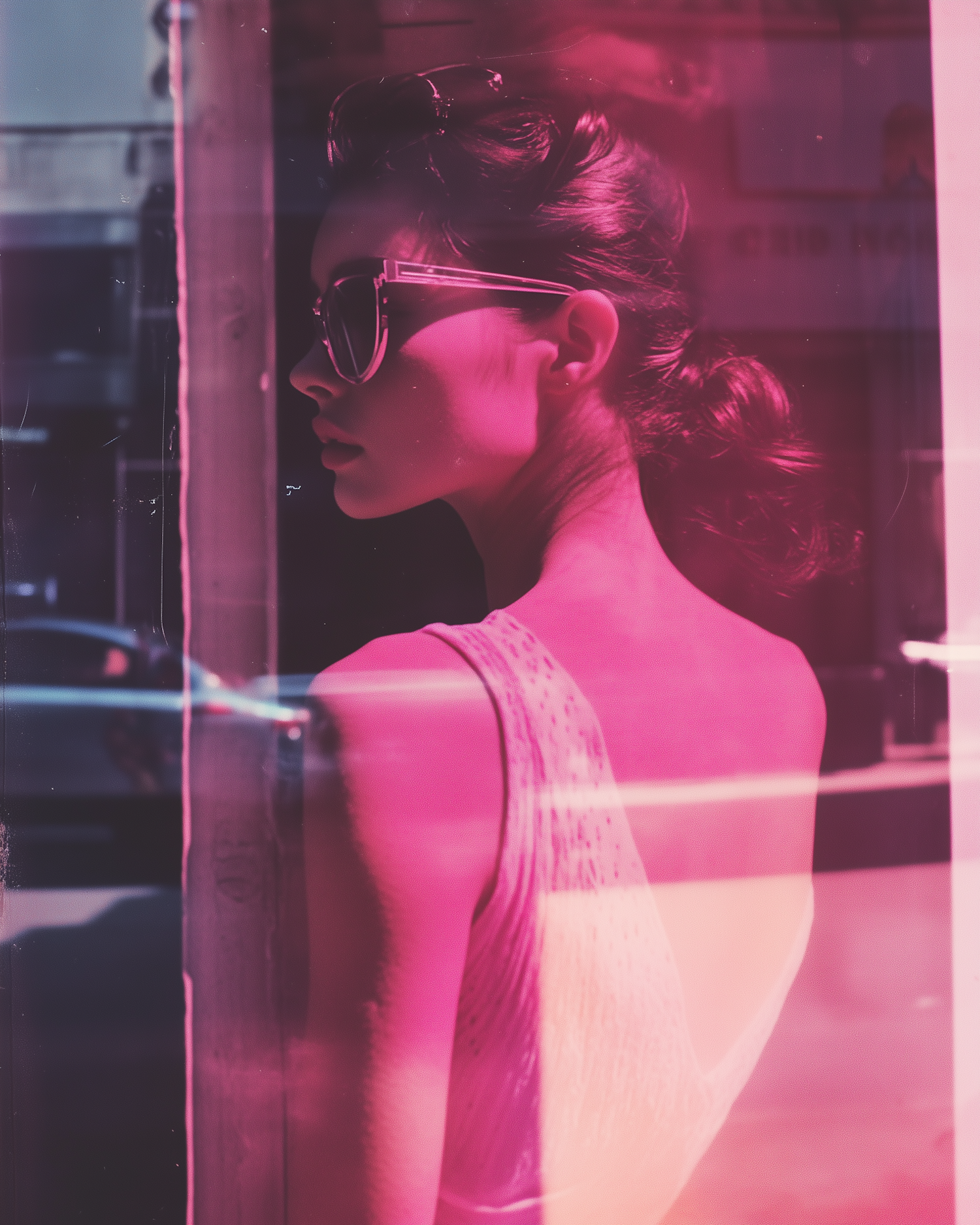 Stylish woman in sunglasses with pink hue, standing by a window. Retro, dreamy vibe with urban reflections.