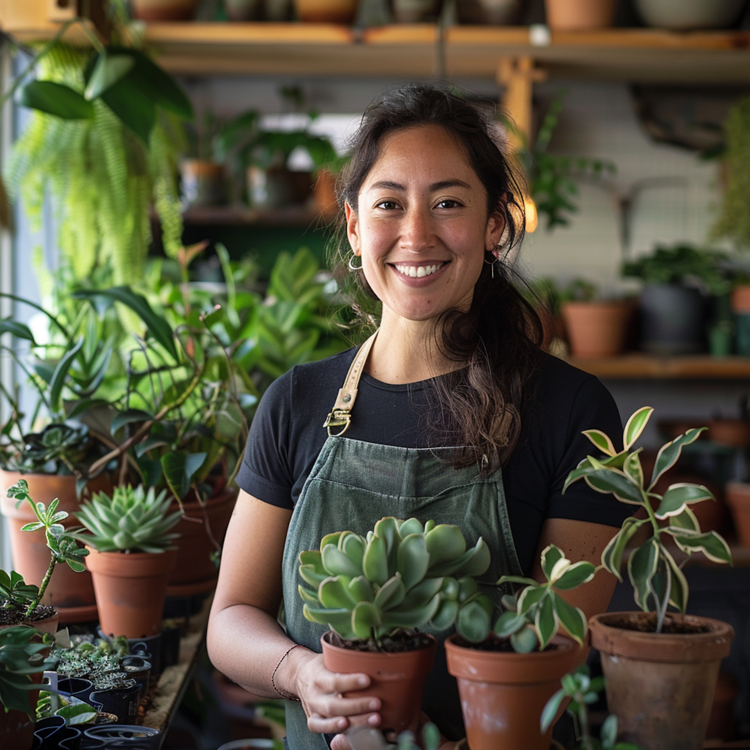 Smiling woman in a plant shop holding a succulent, surrounded by lush greenery and terracotta pots, wearing a green apron and black shirt.