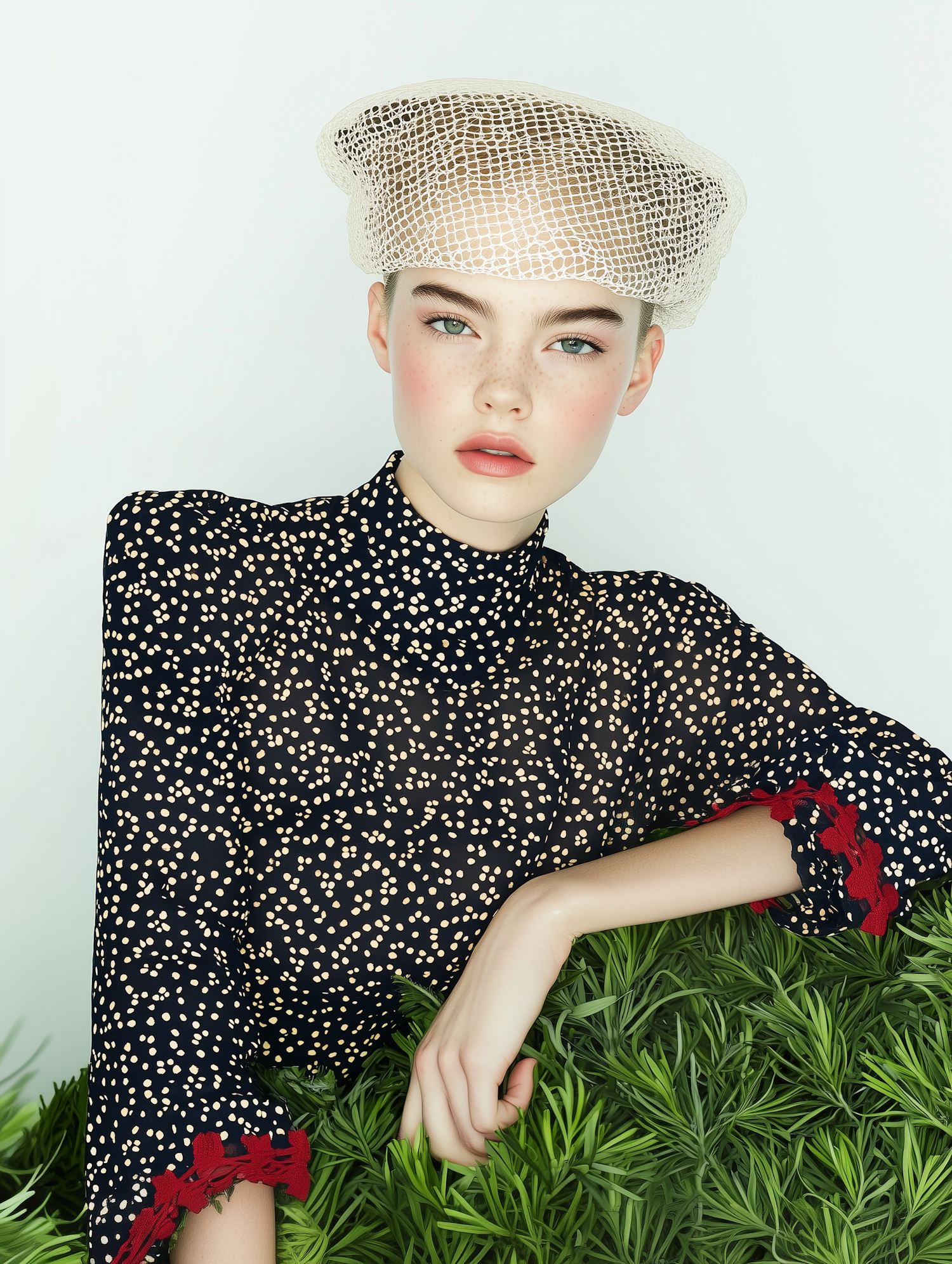 Elegant woman in polka dot dress with netted hat, posing with lush greenery. Striking light blue eyes and soft pink lips.
