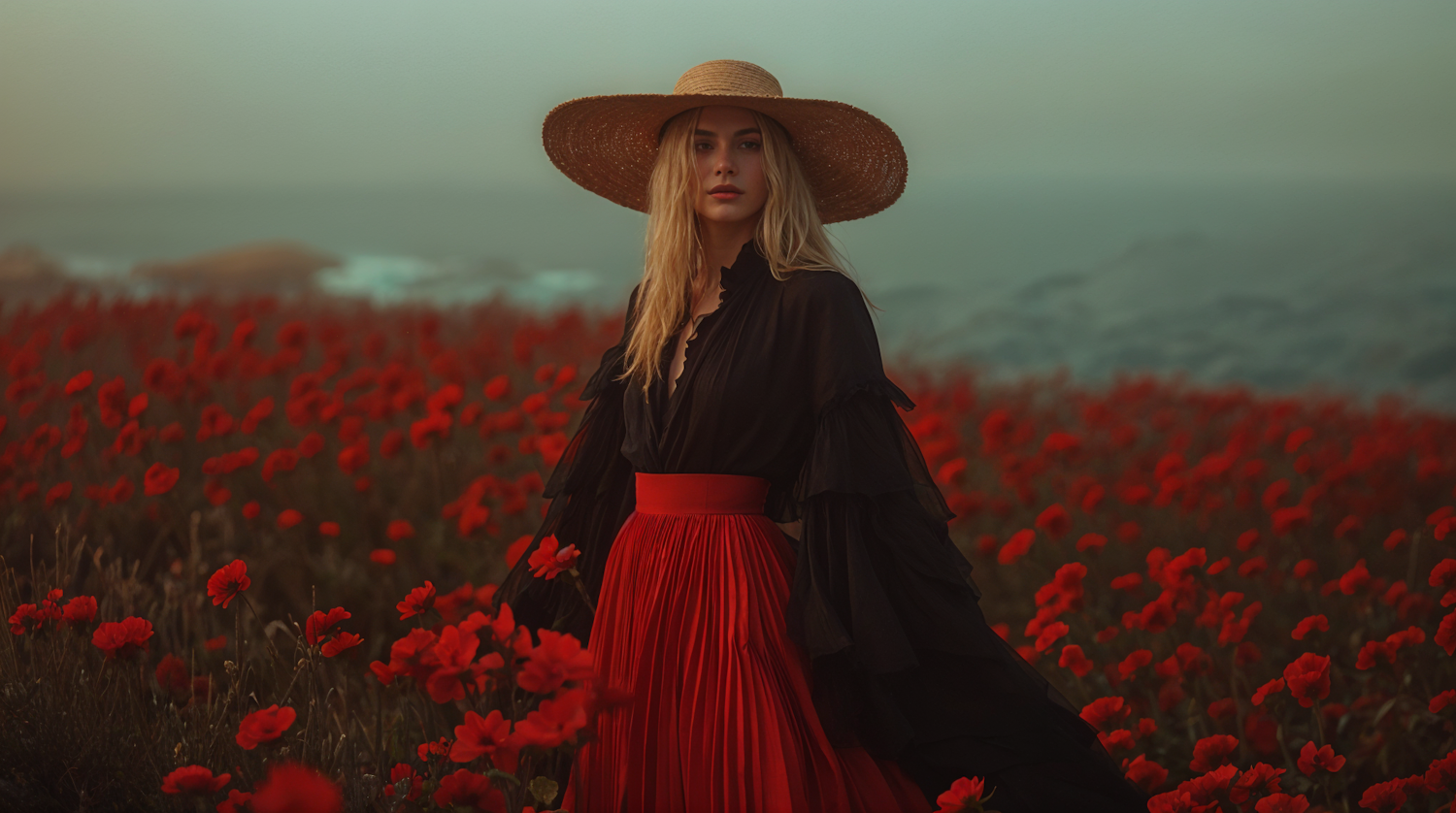 Woman in a field of red poppies, wearing a straw hat, black blouse, and red skirt, with a serene expression and misty background.