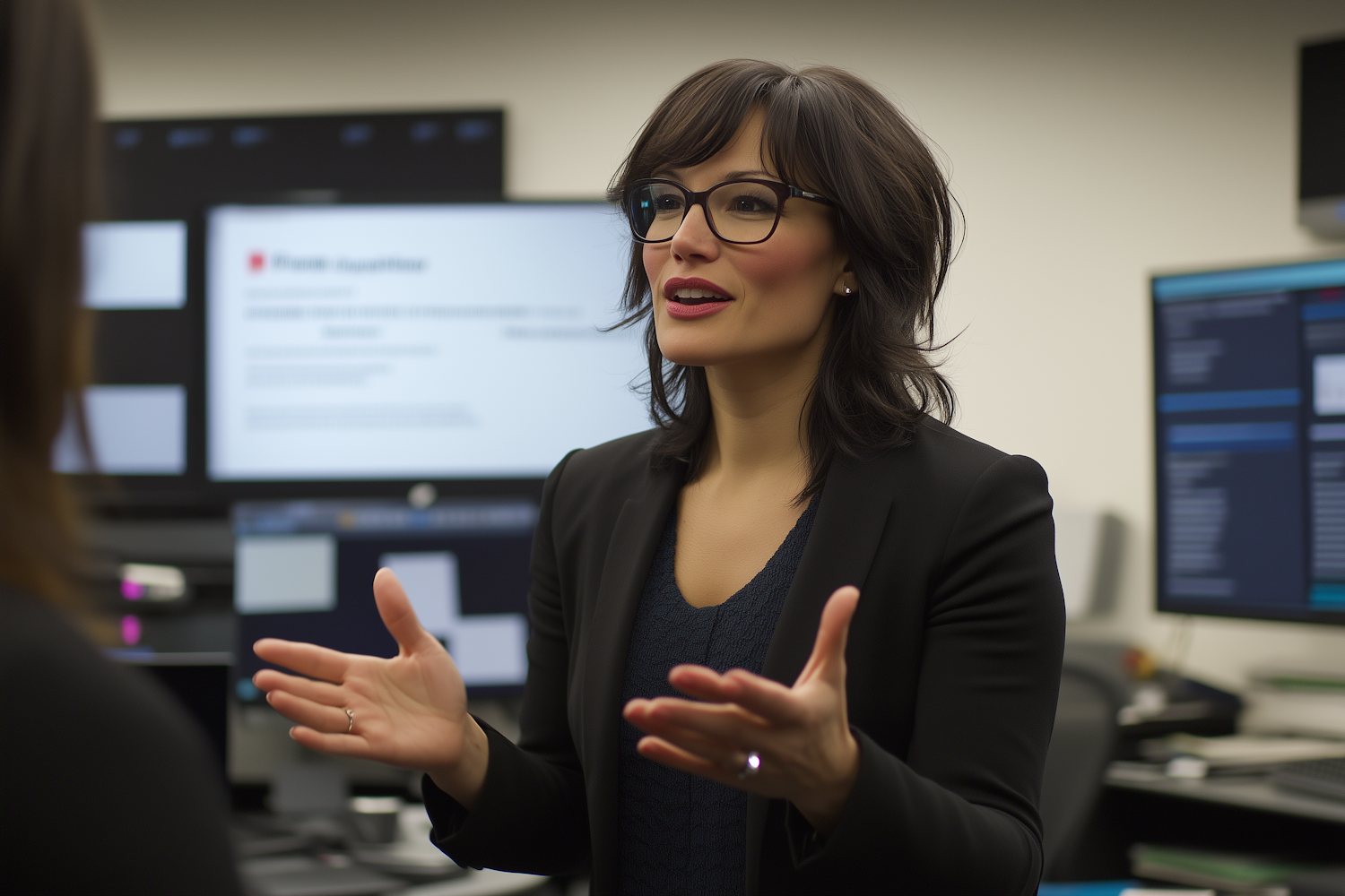 Woman in glasses and blazer gesturing in a tech office, surrounded by computer screens, engaged in a lively discussion.