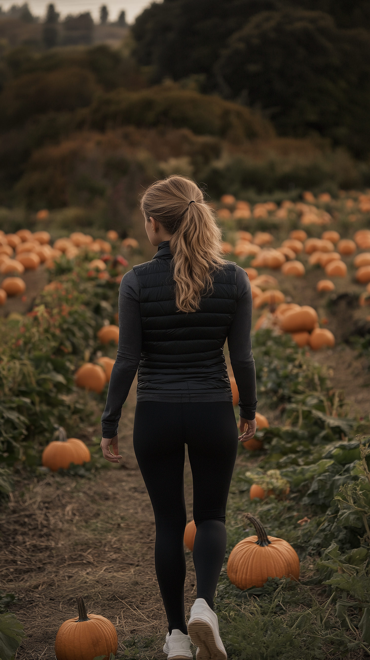 Woman in black vest and leggings walking through a pumpkin patch, surrounded by orange pumpkins and lush greenery.