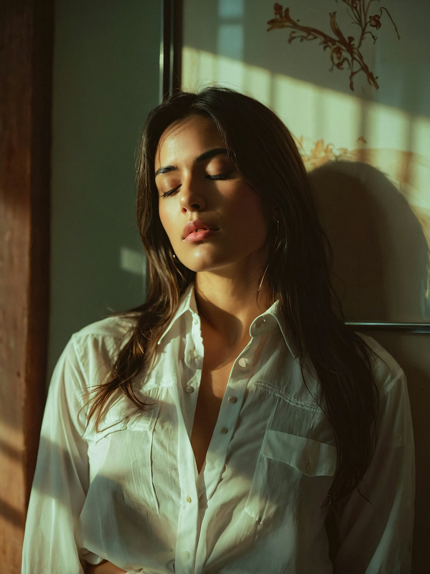 A serene woman in a white shirt basks in warm light, eyes closed, against a simple backdrop, capturing a moment of quiet reflection.