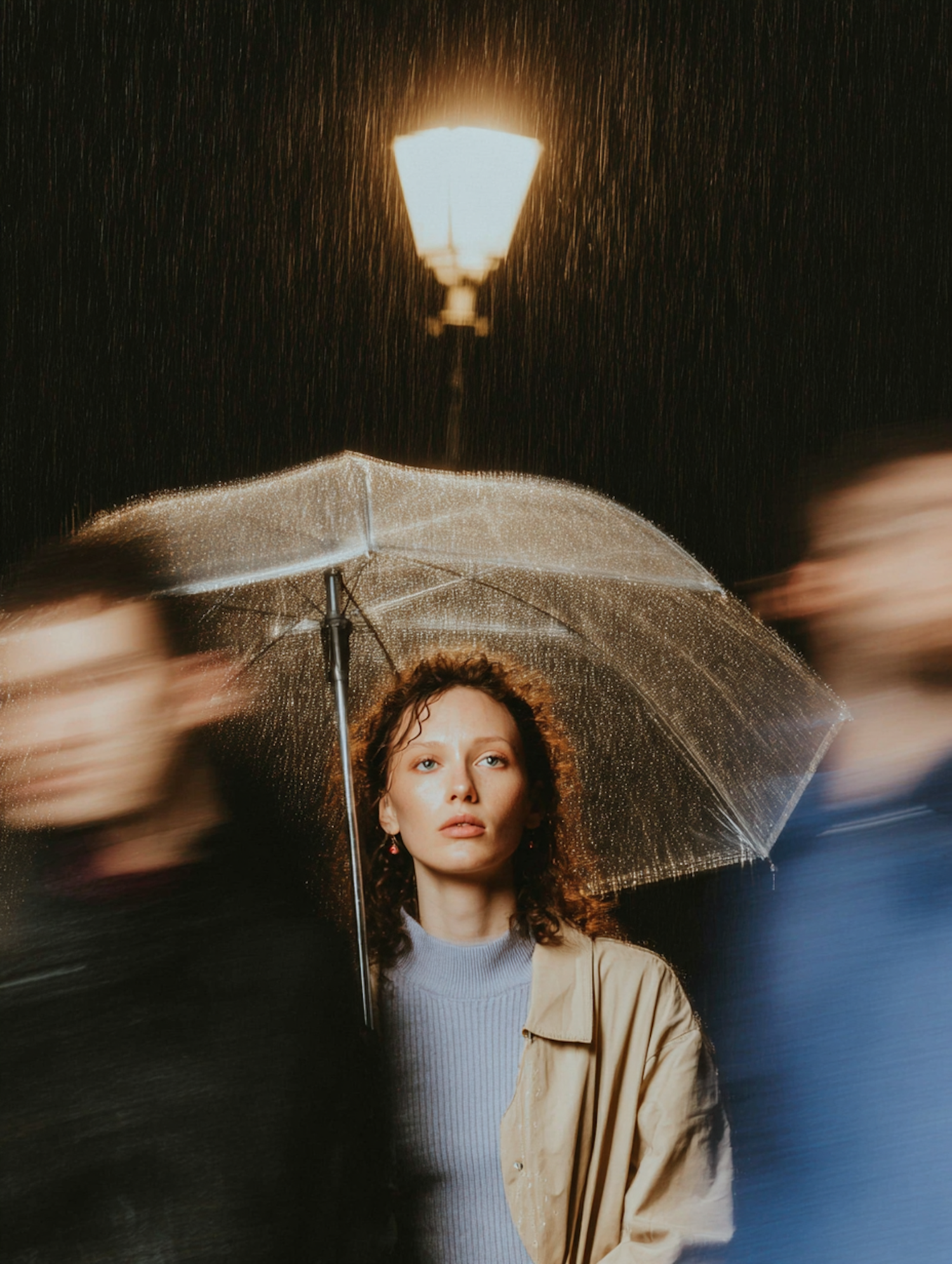 A woman stands under a transparent umbrella in the rain at night, illuminated by a streetlamp, with blurred figures passing by.