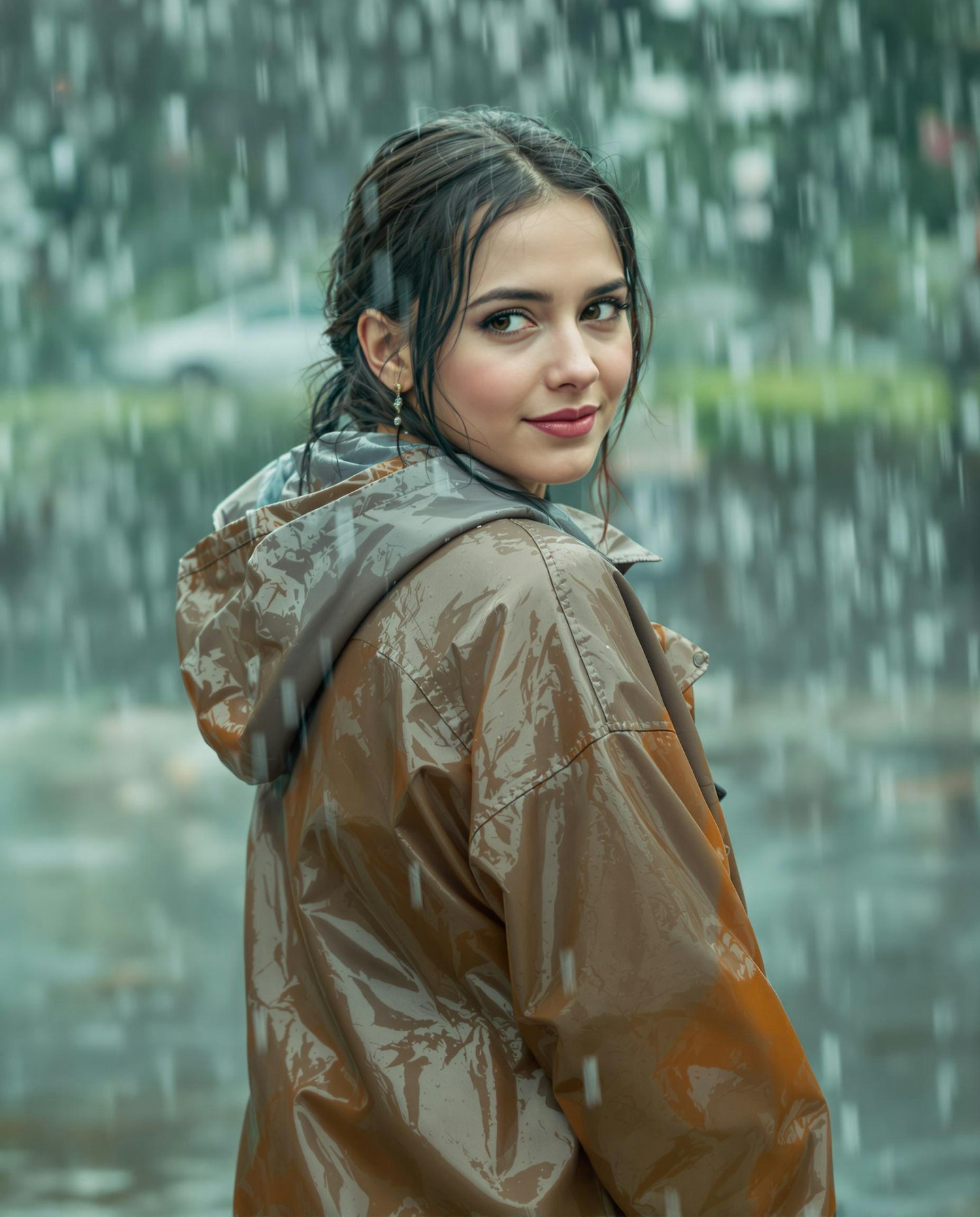 A young woman in a shiny brown raincoat smiles softly in the rain, with blurred greenery and urban elements in the background.
