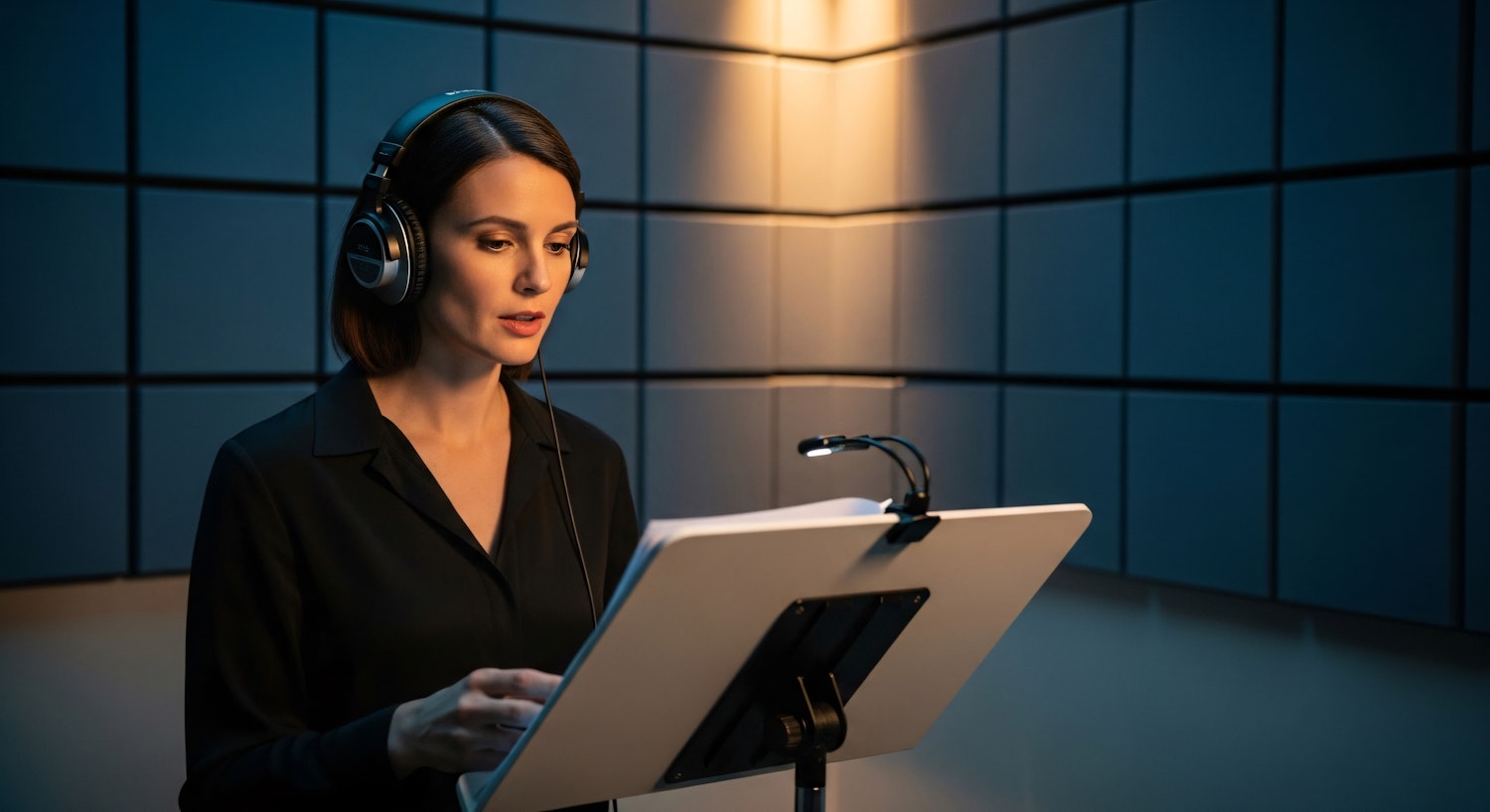 A woman in a recording studio wearing headphones, reading a script on a stand, with soundproof panels in the background.