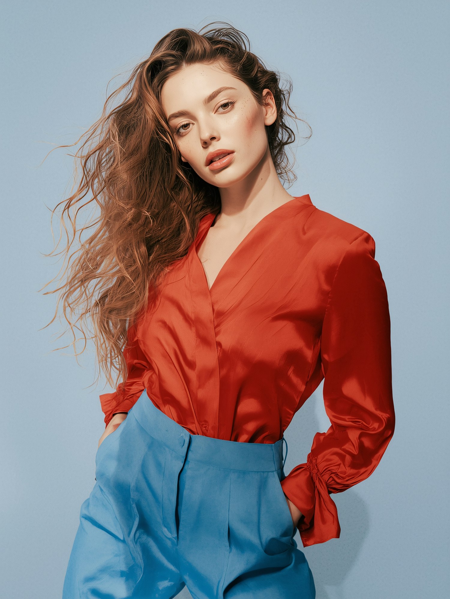 Stylish woman in a red blouse and blue trousers posing against a light blue background, showcasing a bold and colorful fashion look.