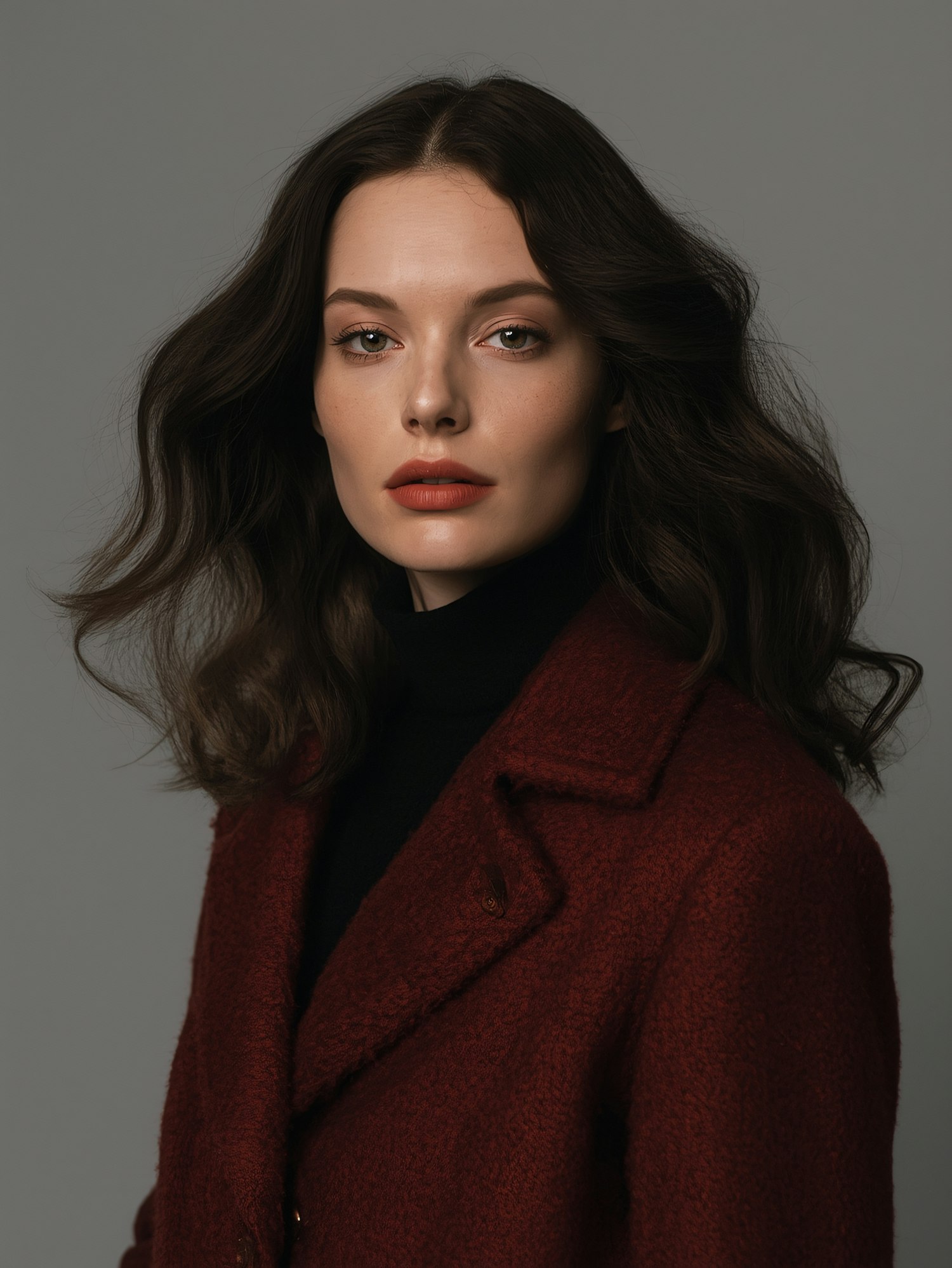 Elegant woman in a red coat and black turtleneck, with wavy dark hair and a neutral expression, set against a gray background.