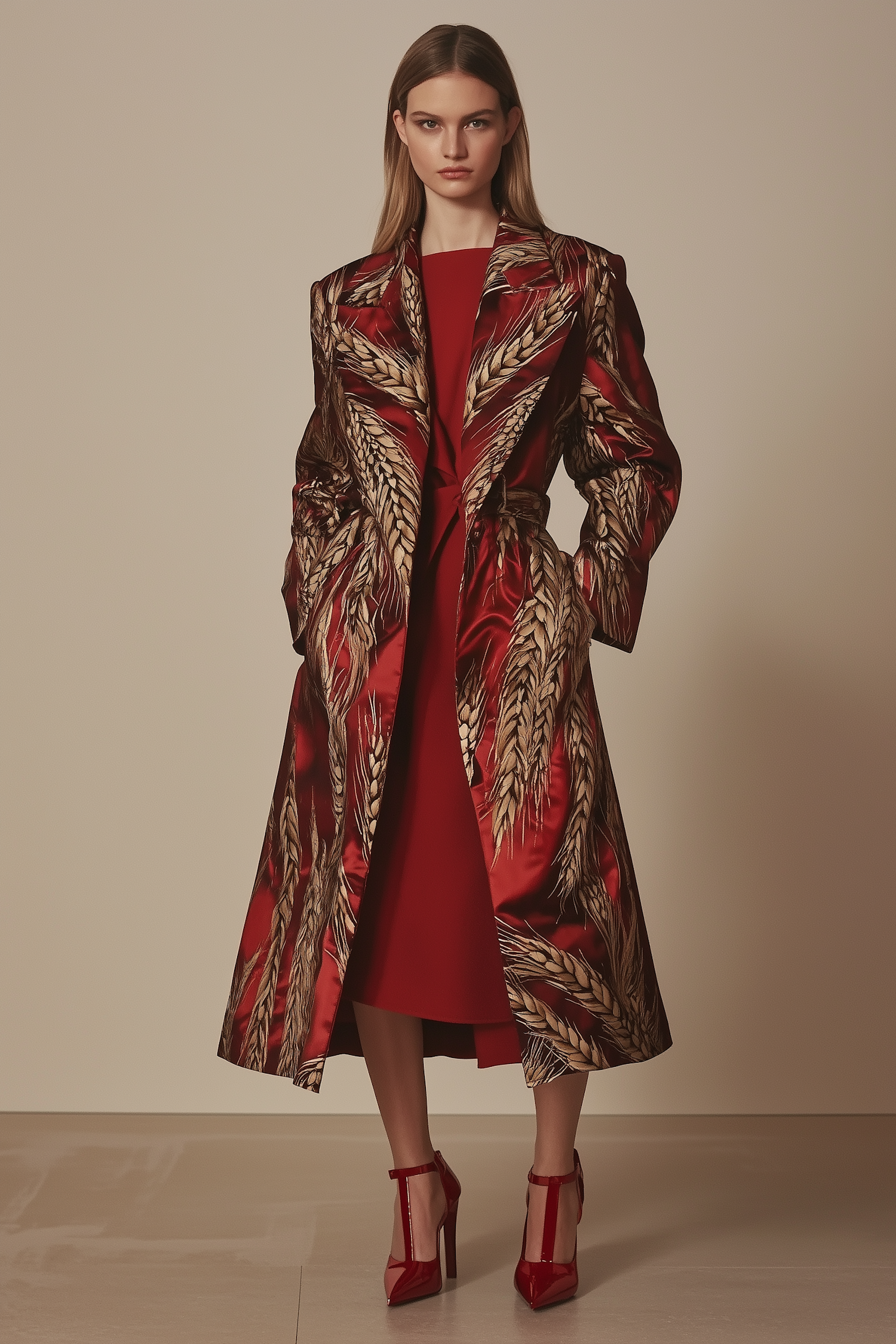 Elegant woman in a red coat with golden wheat patterns, paired with a matching dress and glossy red heels, exuding sophistication.