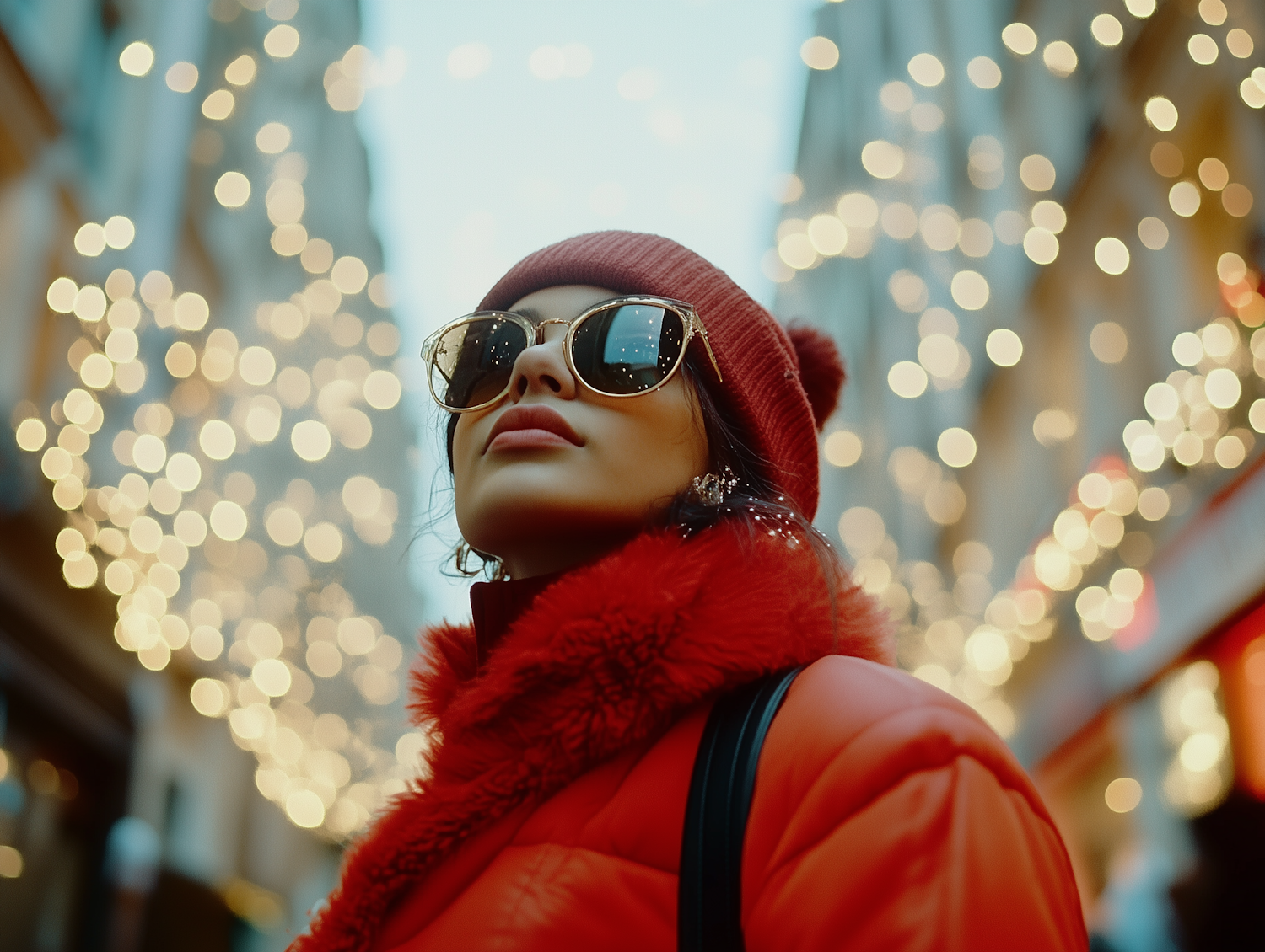Stylish woman in red coat and beanie with sunglasses, surrounded by festive bokeh lights in an urban setting.