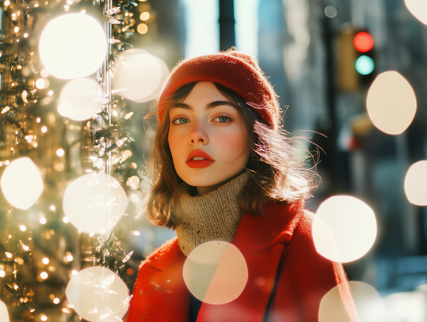 A young woman in a red beret and coat stands amidst festive bokeh lights, creating a dreamy and warm holiday atmosphere.