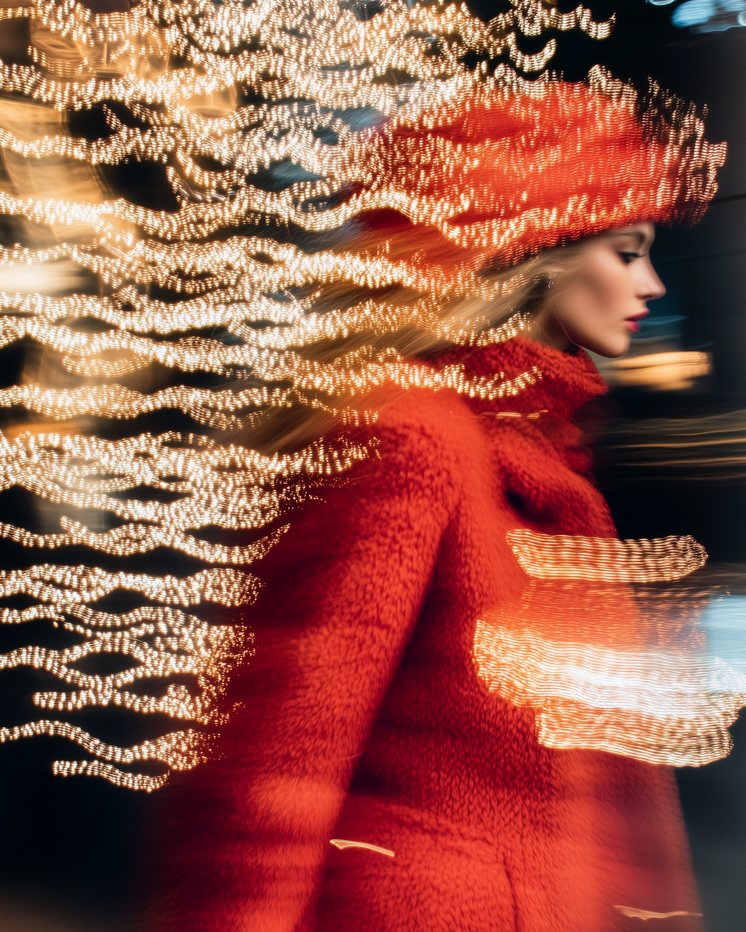 Dynamic image of a woman in red with swirling festive lights, creating a vibrant and energetic atmosphere.