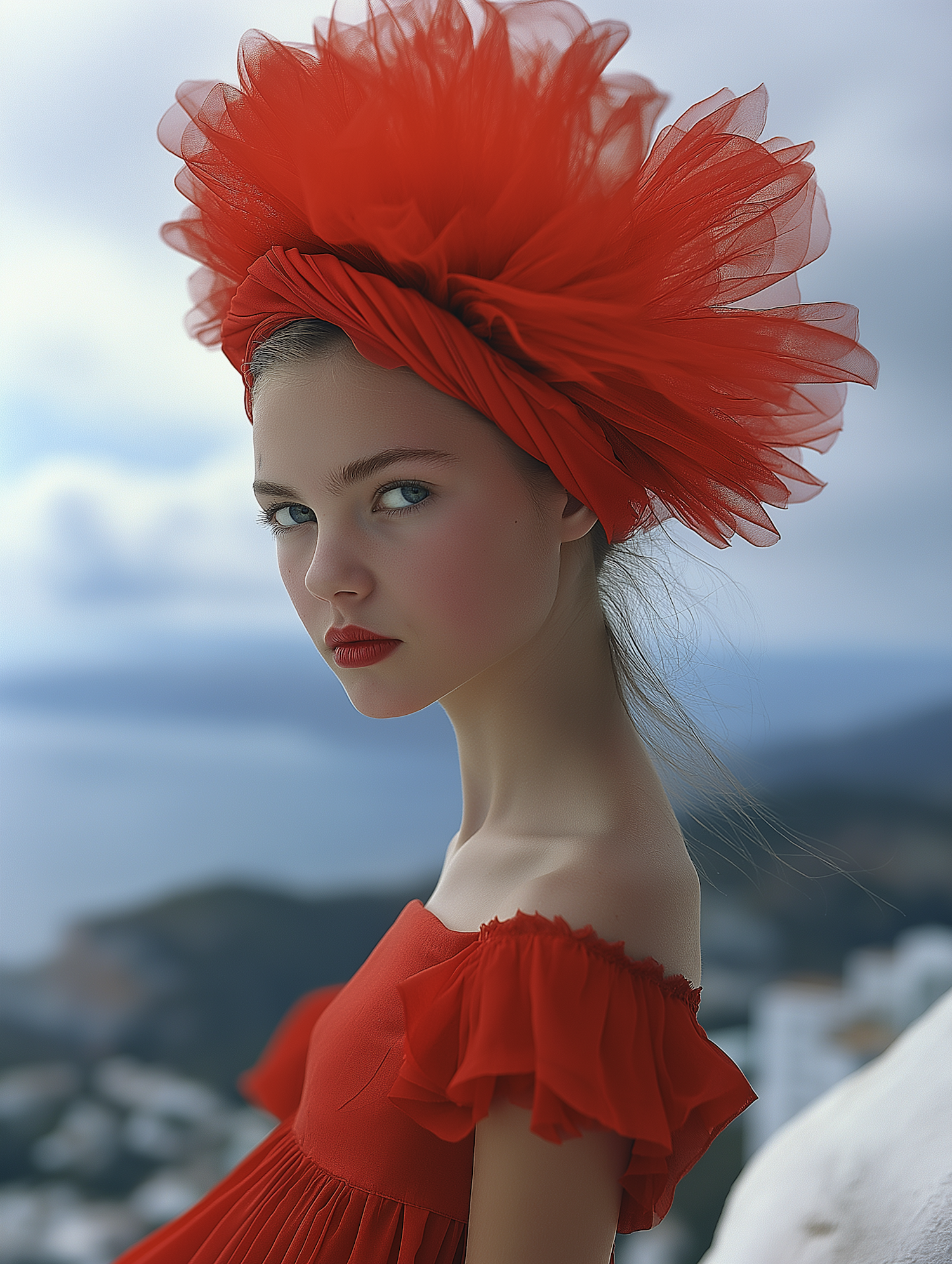 Young woman in a red dress and headpiece, gazing intently with a coastal backdrop. Striking red tones dominate the scene.