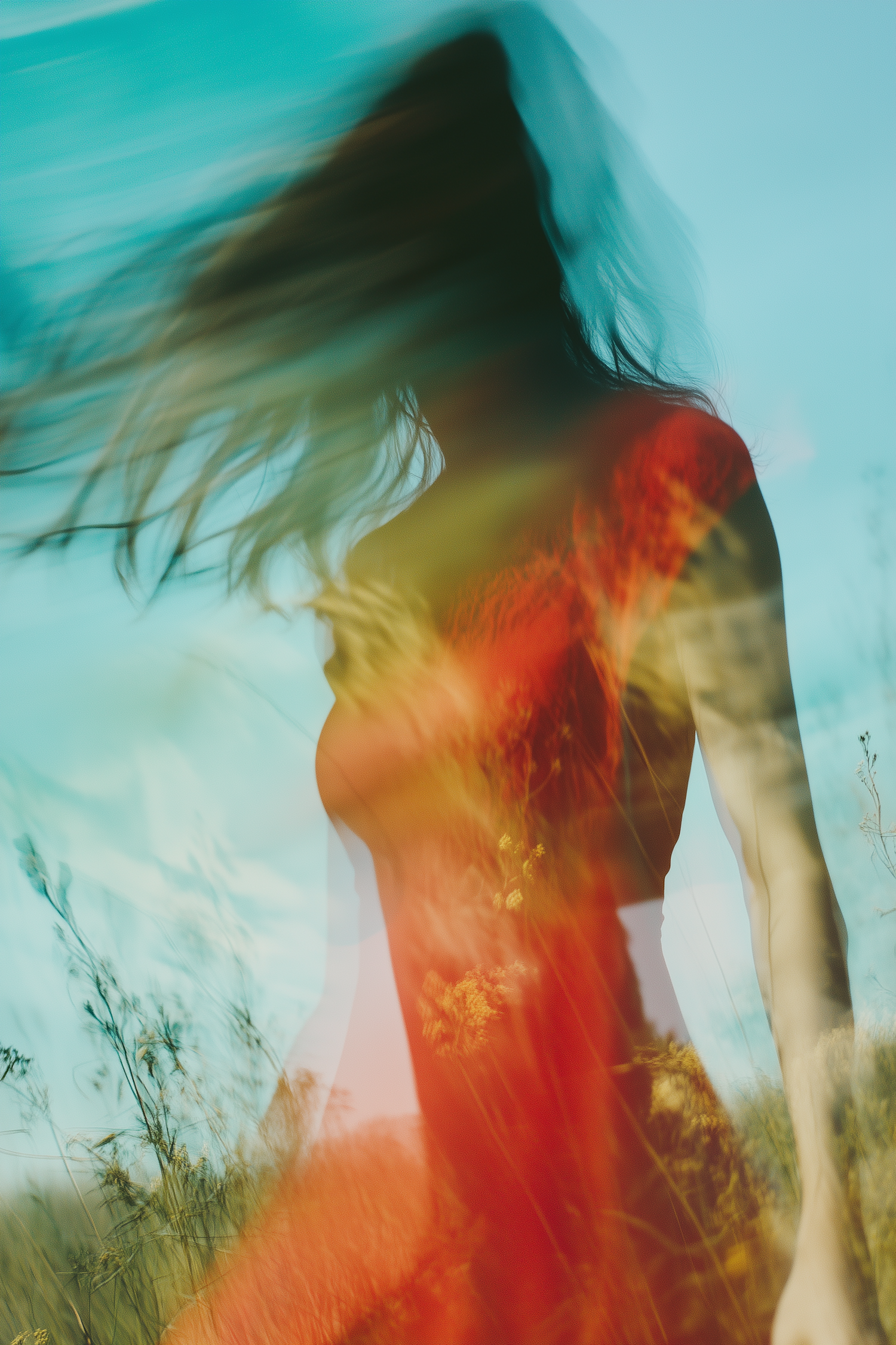 Blurred artistic shot of a woman in a red dress with flowing hair, set against a bright blue sky and grassy field. Dreamlike and vibrant.