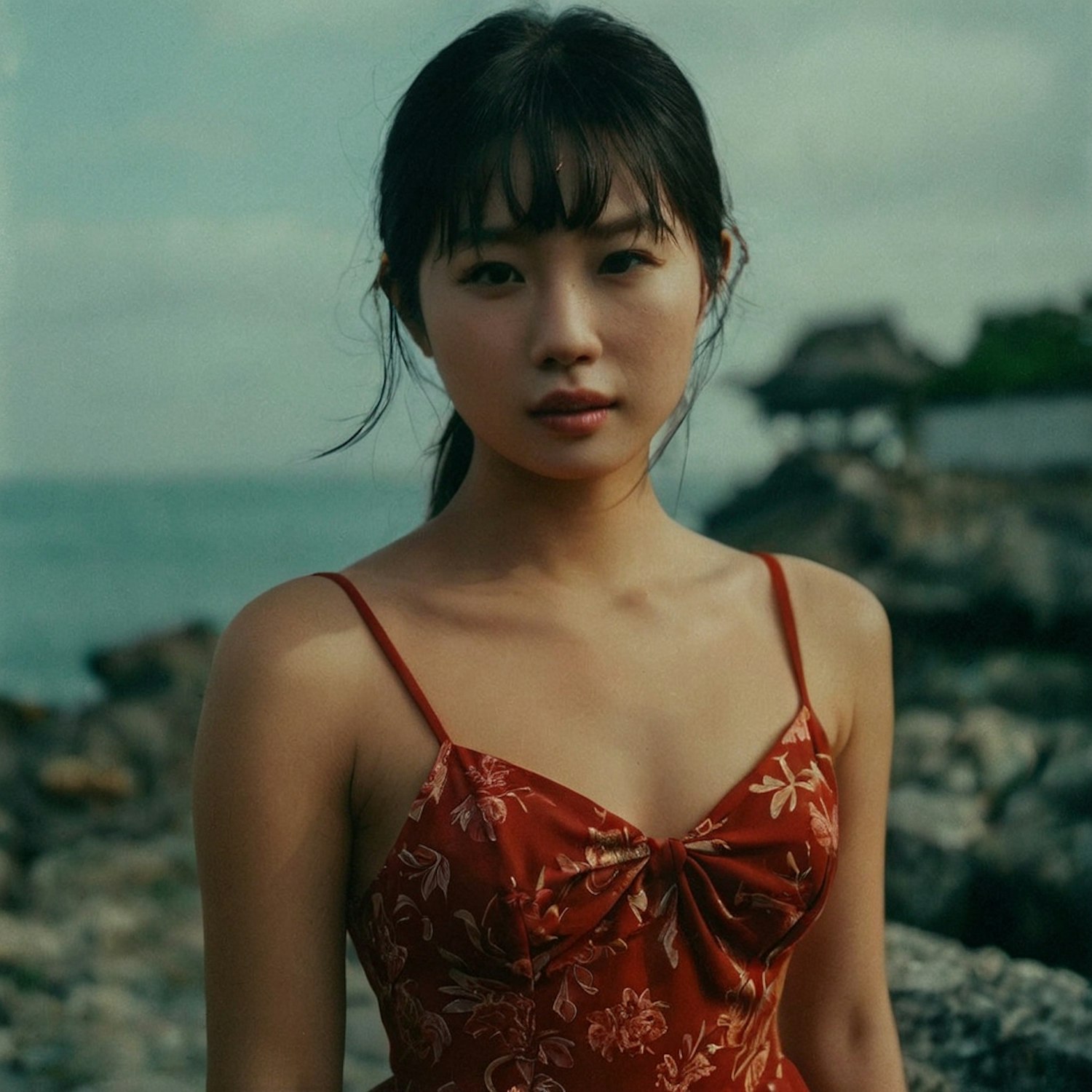 Asian woman in a red floral dress by the seaside, with a calm expression and soft lighting, creating a serene and contemplative mood.