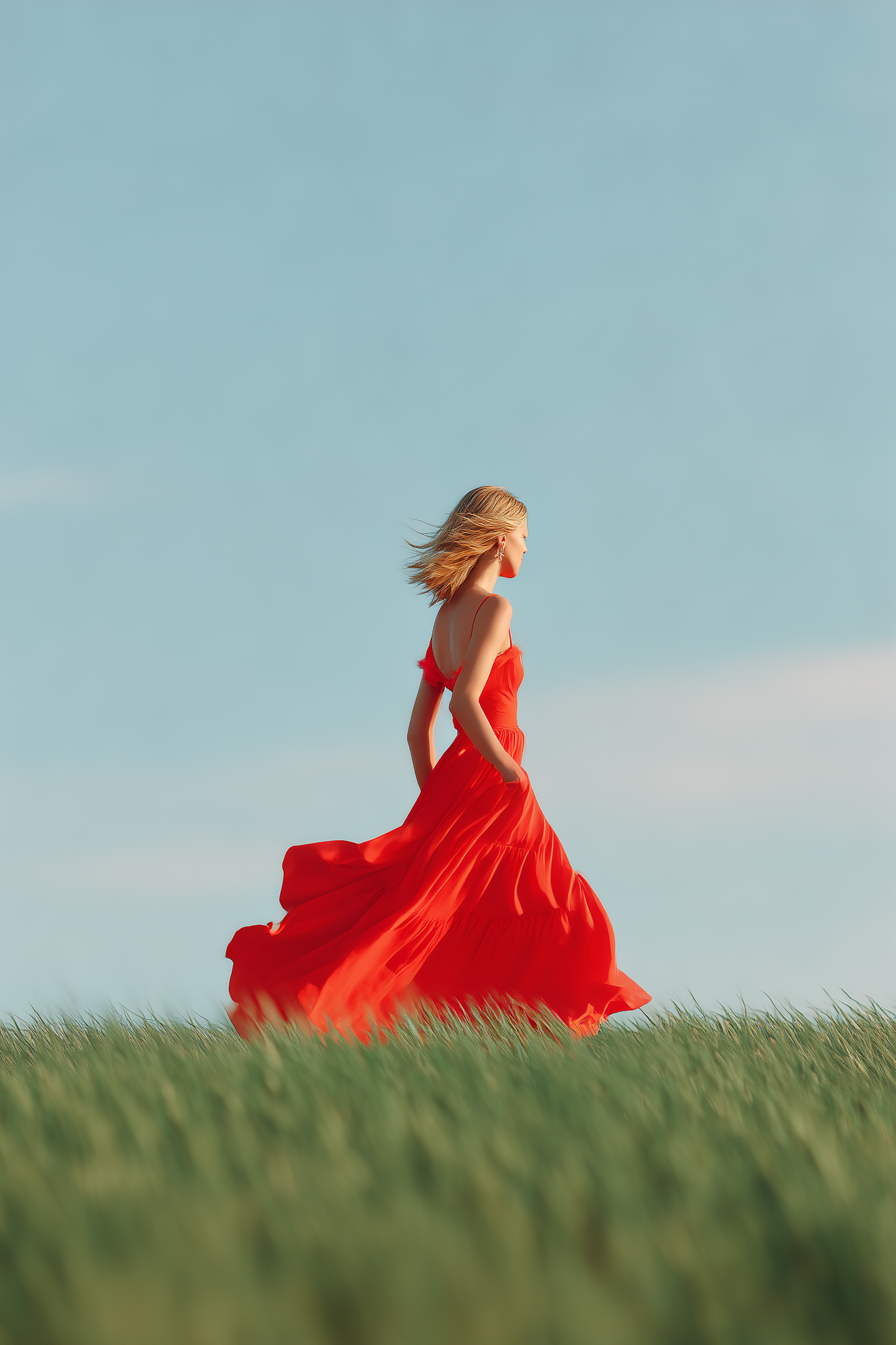 A woman in a flowing red dress stands in a green field under a clear blue sky, her blonde hair blowing gently in the breeze.
