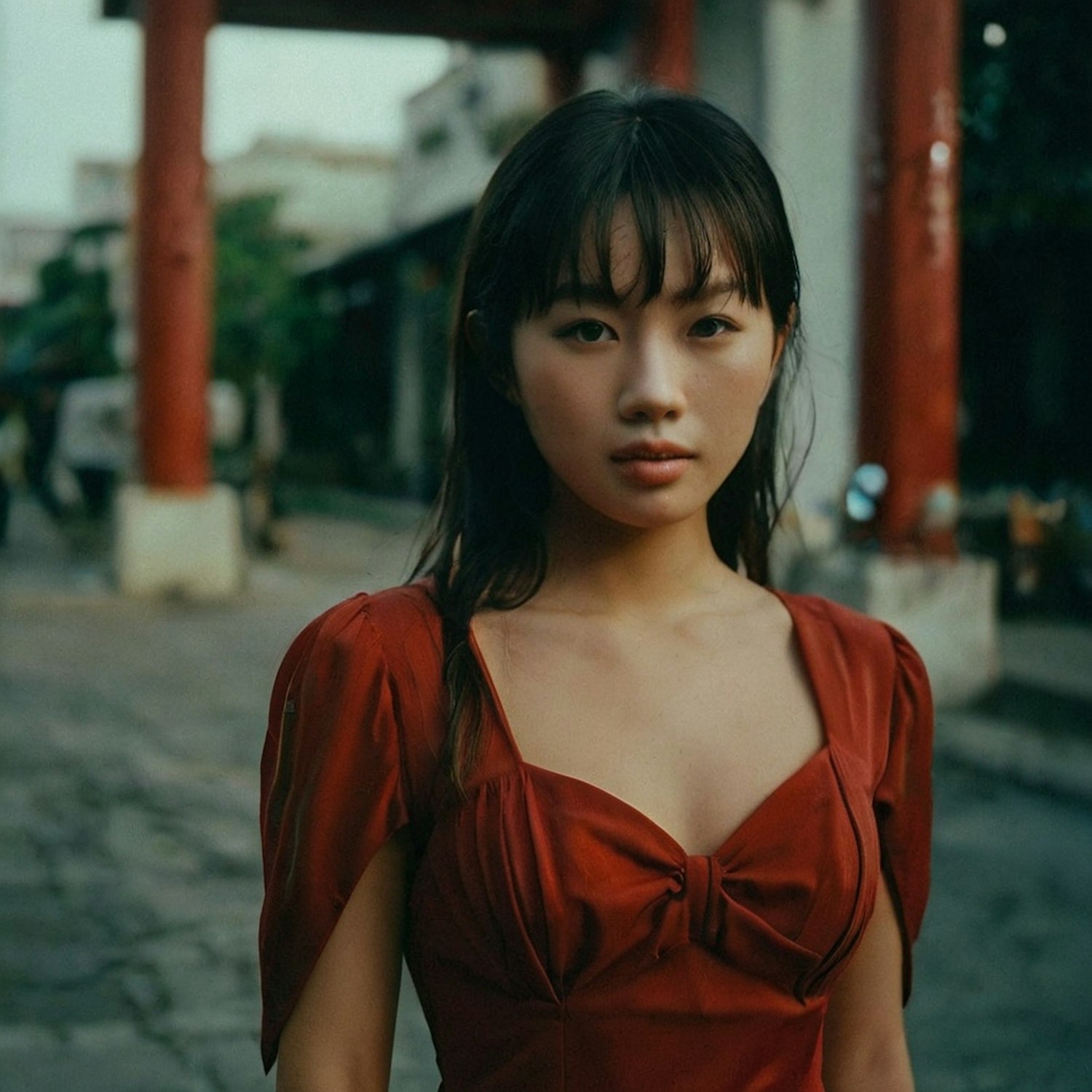 Asian woman in a red dress stands confidently outdoors, with blurred urban background and soft lighting enhancing her serene expression.