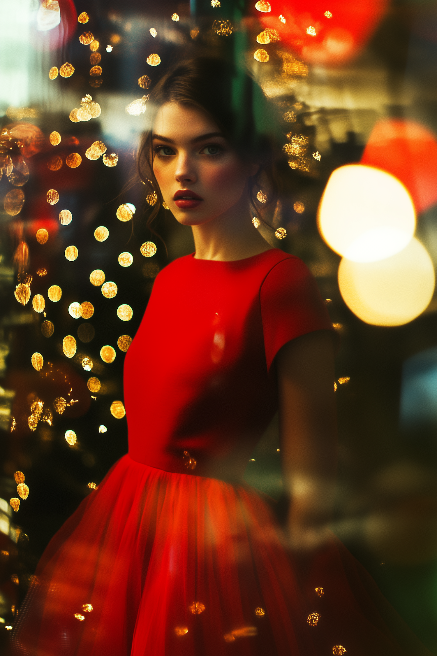 Elegant woman in a red dress amidst festive golden bokeh lights, creating a warm and enchanting atmosphere.