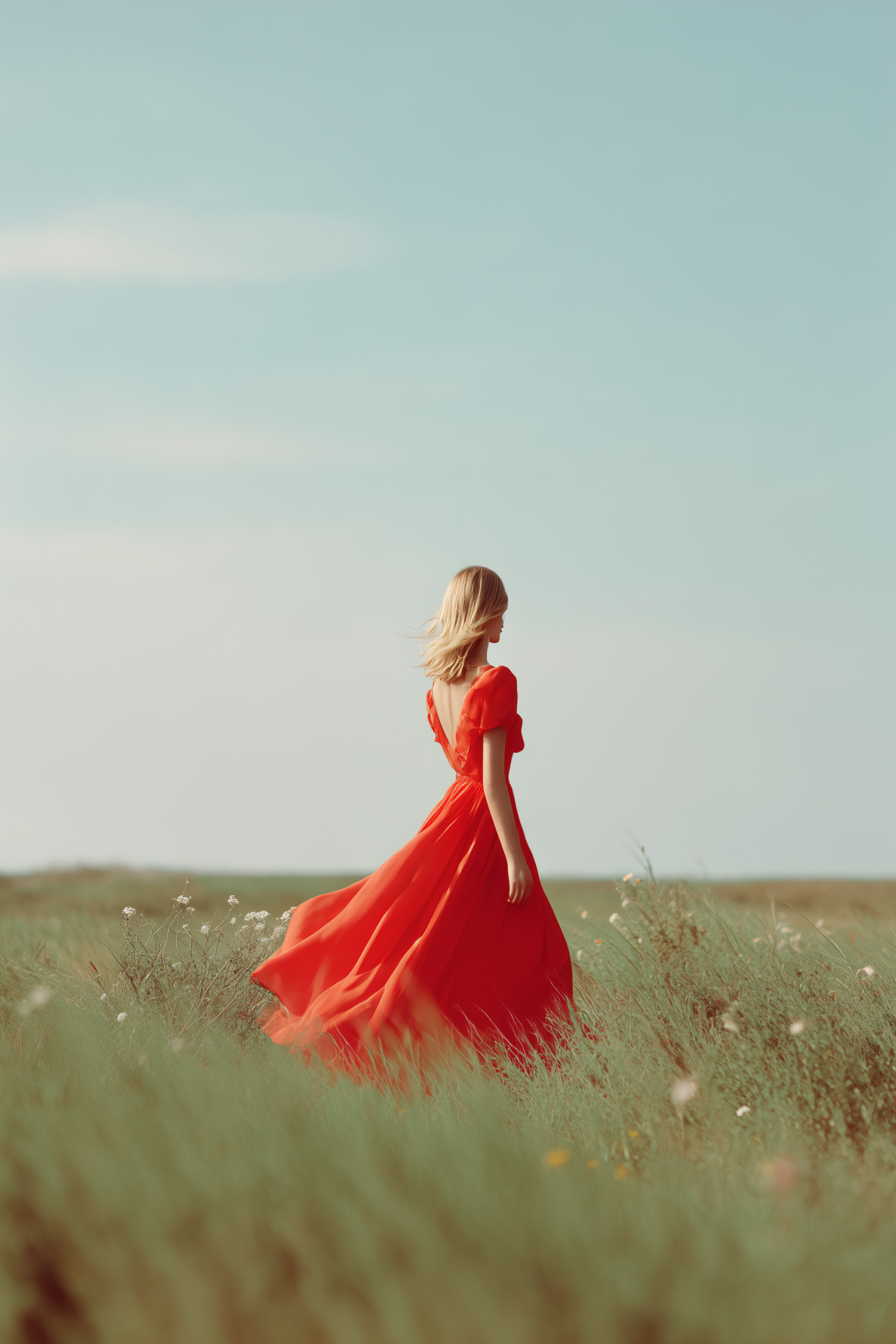 A woman in a flowing red dress walks through a green field under a clear blue sky, surrounded by wildflowers and serene nature.