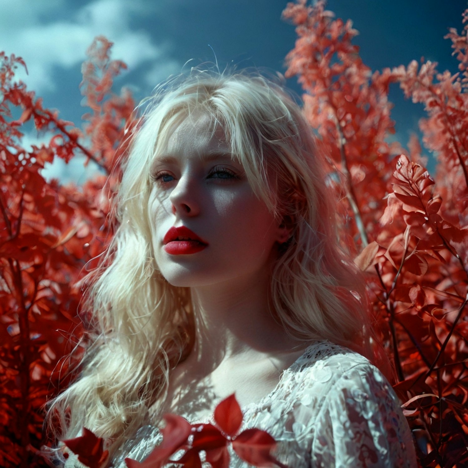 Ethereal portrait of a blonde woman with red lips amidst vibrant red foliage under a deep blue sky.