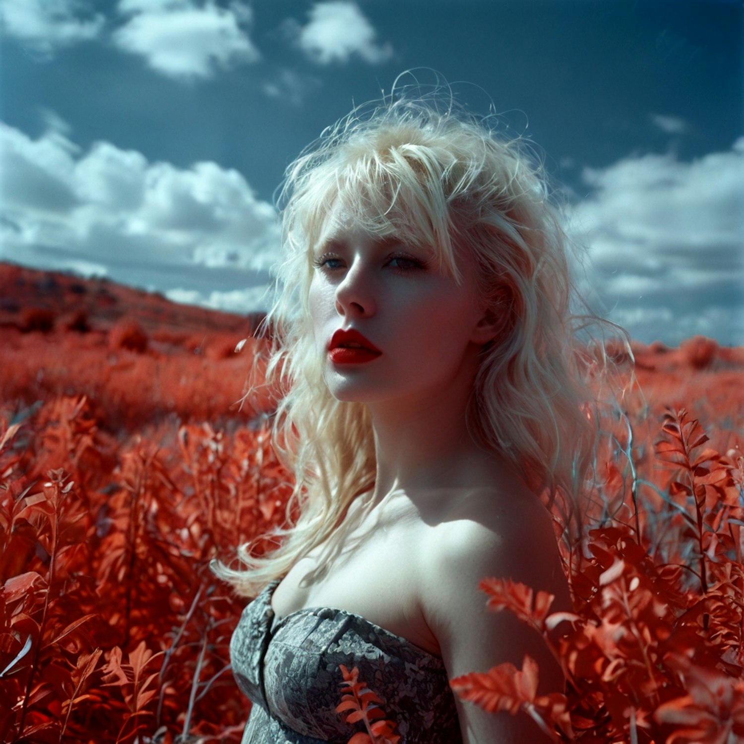 Blonde woman in a surreal red field with blue sky, showcasing vibrant infrared photography. Face blurred for privacy.