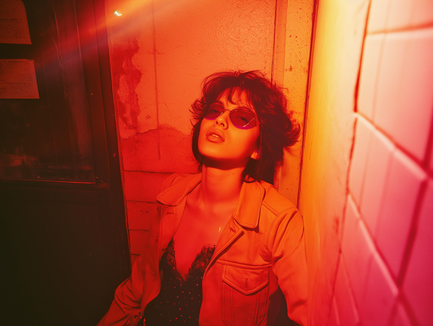 Stylish woman in sunglasses leans against a wall in warm, moody lighting, exuding cool and effortless style.