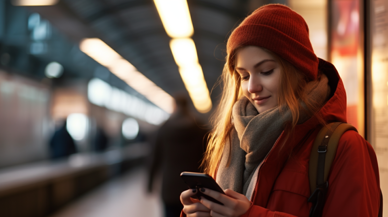 Young woman in red beanie and jacket using smartphone in a subway station, creating a cozy contrast to the bustling environment.