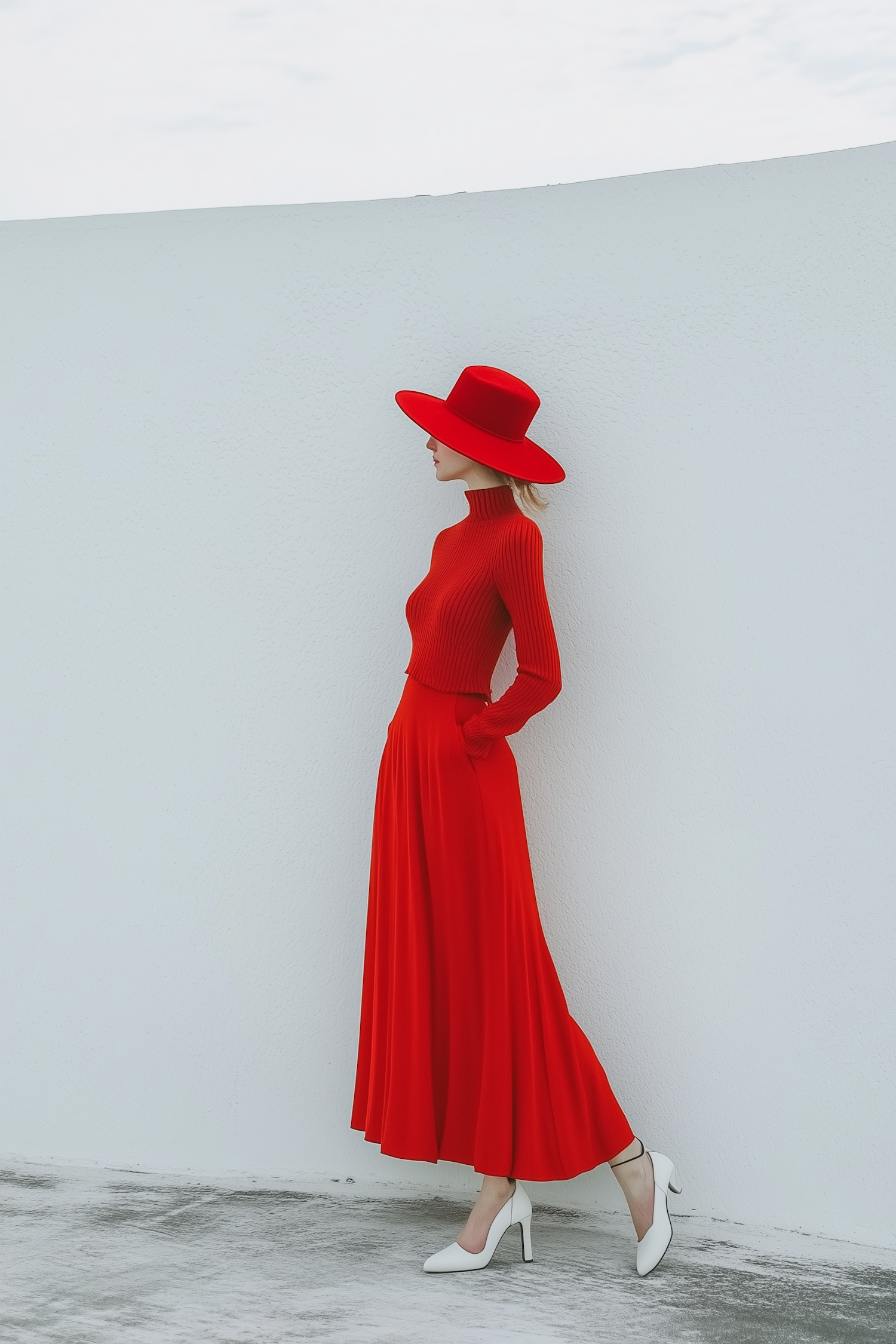 A woman in a bold red outfit with a matching hat poses against a minimalist white wall, paired with white heels for a striking contrast.